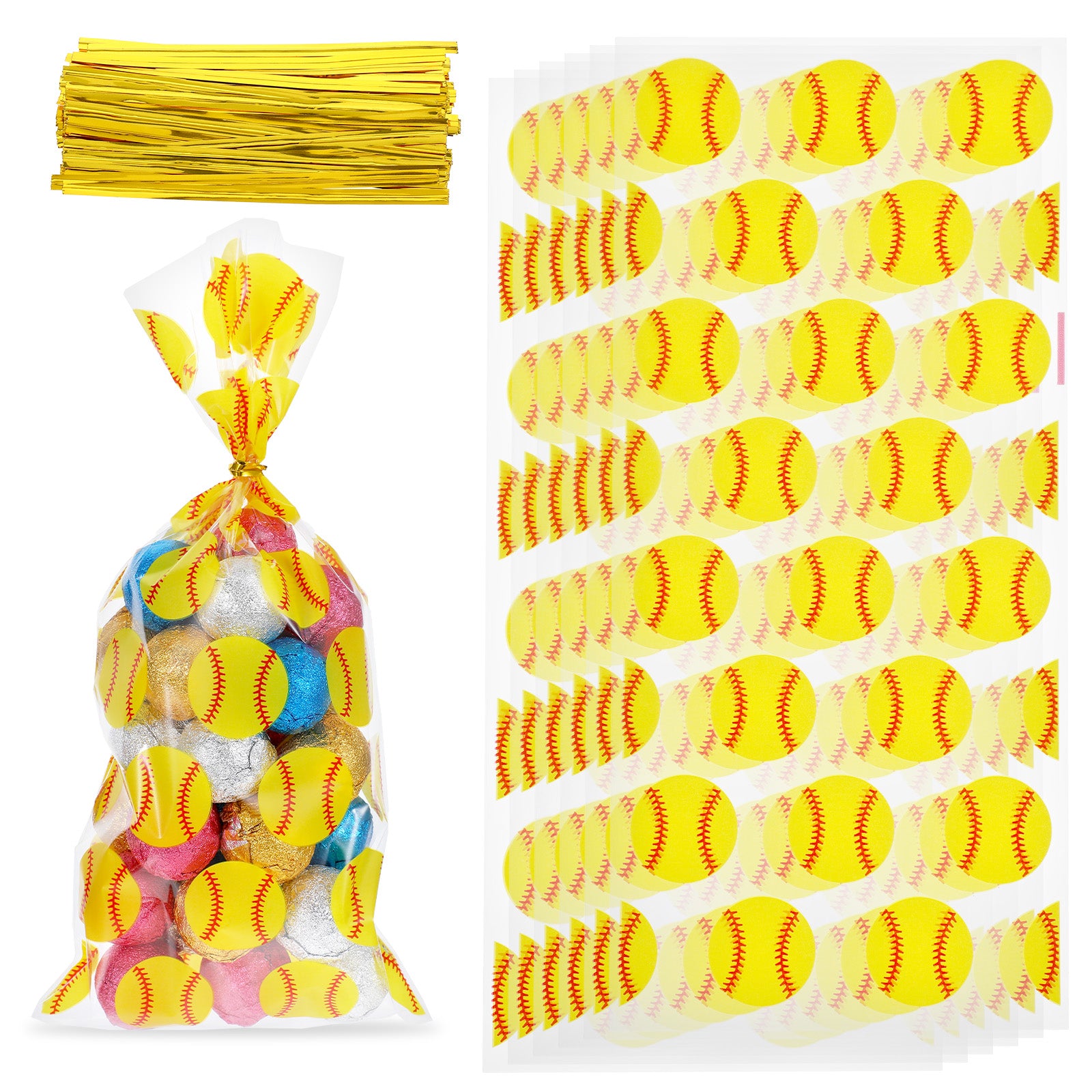 100 Pcs Softball Gift Bag, Clear Softball Goodie Bags, Plastic Snack Bags with Twist Ties, Snack Goodie Candy Cookies Cellophanes Bag Baseball Gold Balls Game Team Party Favor Supplies