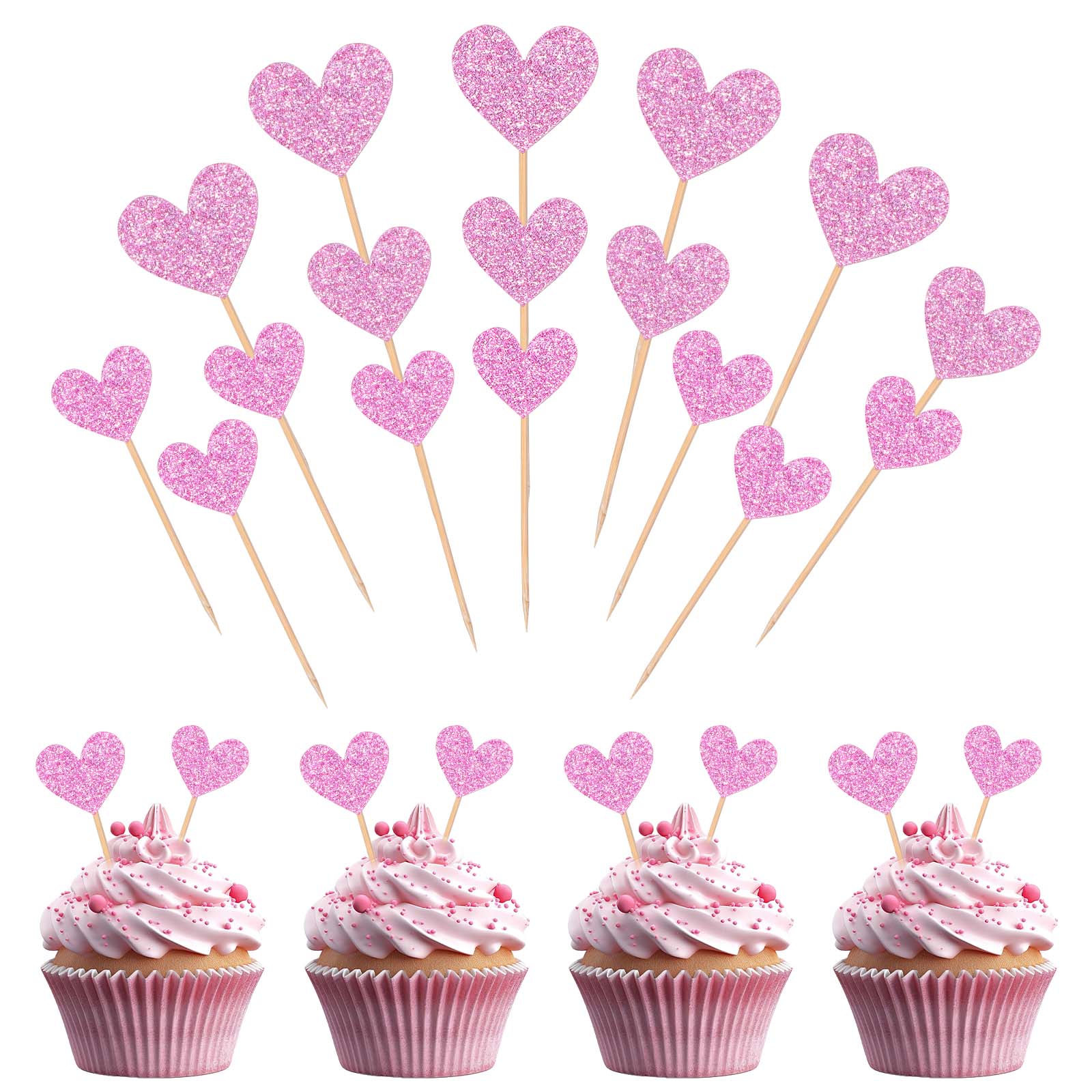 60pcs Heart Cupcake Toppers Valentine's Day Sweet Love Cake Decorations,Glitter Cupcake Picks for Wedding Engagement,Bridal Baby Shower Cupcake Topper Sticks, New Year Party Cake Supplies(Pink)