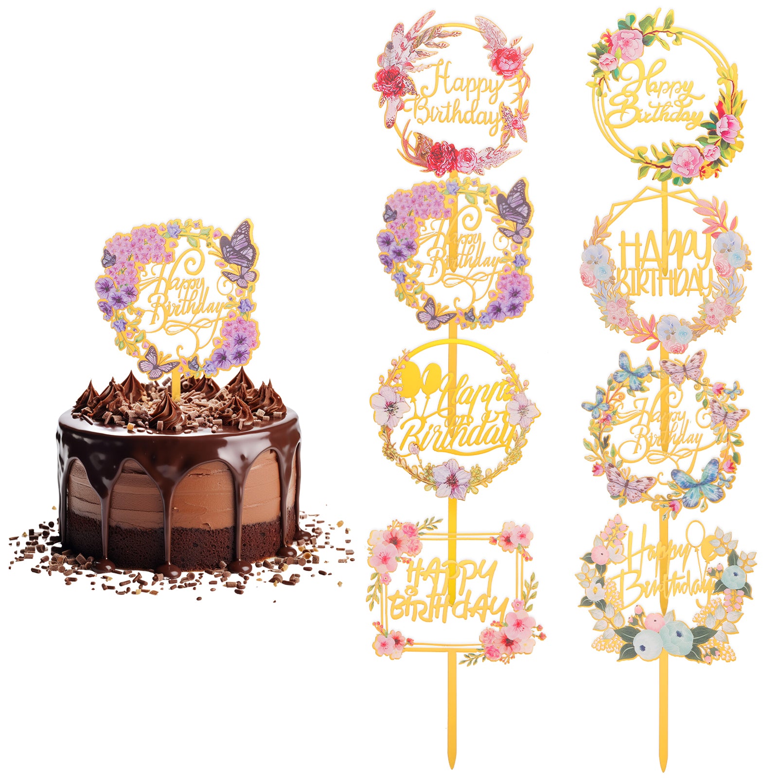 8 Pcs Happy Birthday Cake Toppers Flower and Butterfly Cake Topper Acrylic Cake Toppers Happy Birthday Sign Happy Birthday Topper For Birthdays Weddings Anniversaries Party Decorations