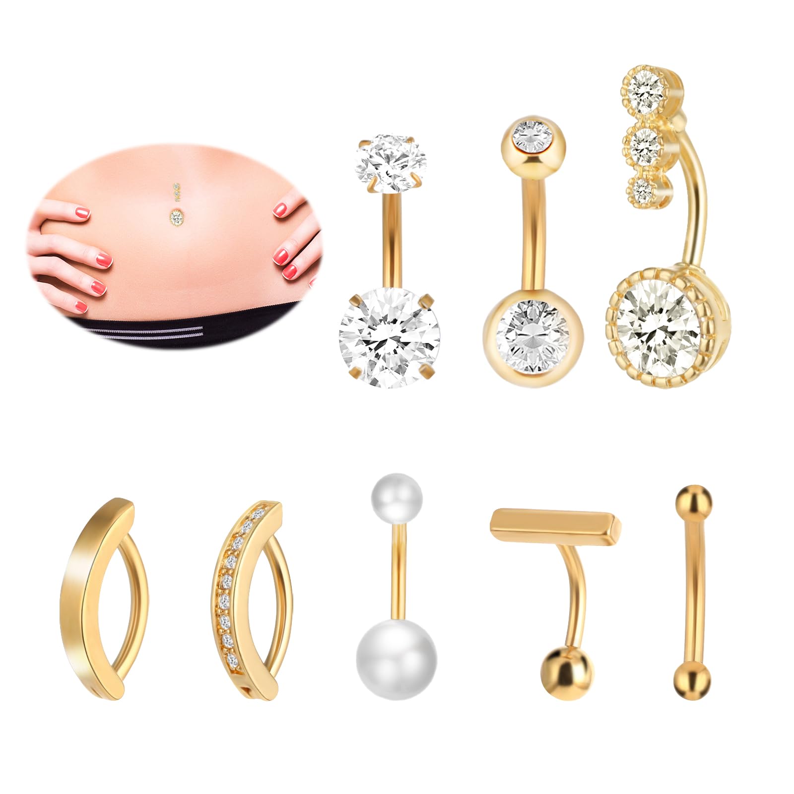 9pcs Belly Ring,Gold Belly Bar,Steel Belly Button Rings,Belly Button Piercing Kit,Round Pearl Diamond Women Cute Piercing Jewelry Belly Button Piercing Jewelry