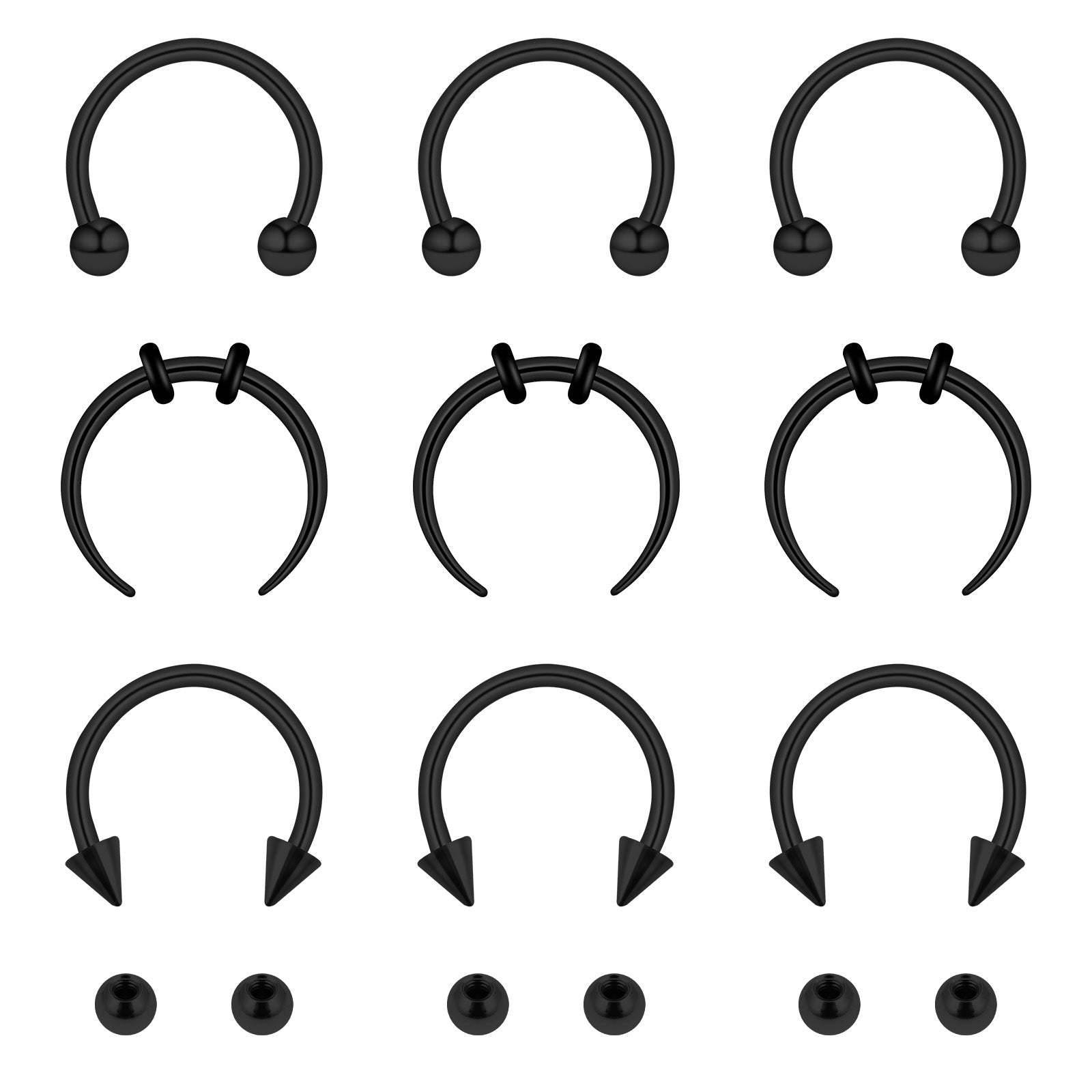 9PCS Septum Rings Stainless Steel Septum Nose Rings for Women Man Eyebrow Helix Cartilage Horseshoe Nose Ring with Replacement Ball Black Piercing Jewelry 10mm
