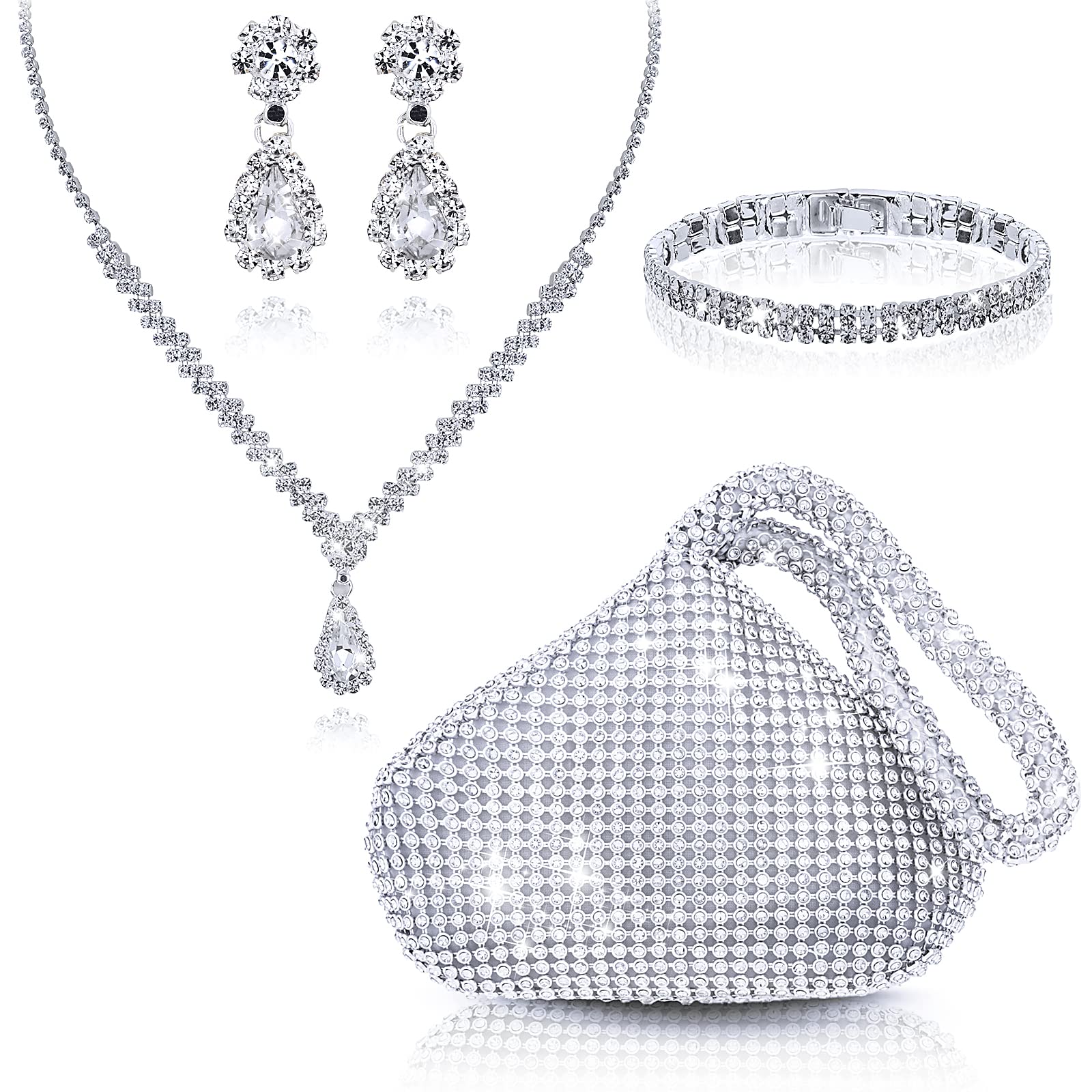 Bridal Wedding Jewelry Set Silver Clutch Purse Bag Rhinestone Evening Bag Necklace Earrings Bracelet Brides Bridesmaid Prom Costume Jewelry Set for Women and Girls