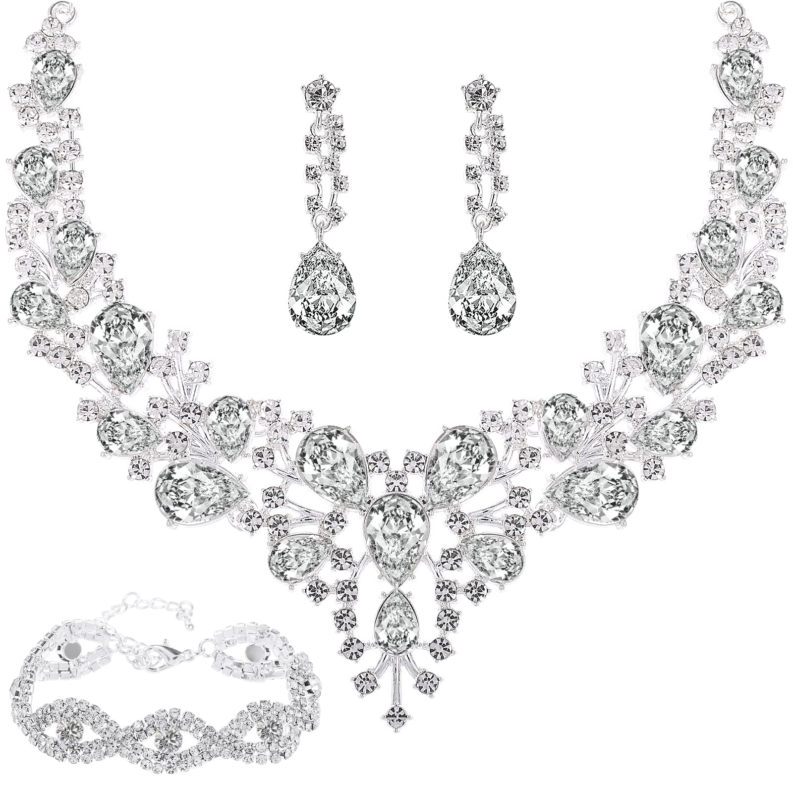 Bride Jewelry Set Rhinestone Wedding Jewelry Set Silver Crystal Wedding Necklace Bracelet Earrings Jewelry Set Bridesmaids Prom Jewelry Set for Women and Girls