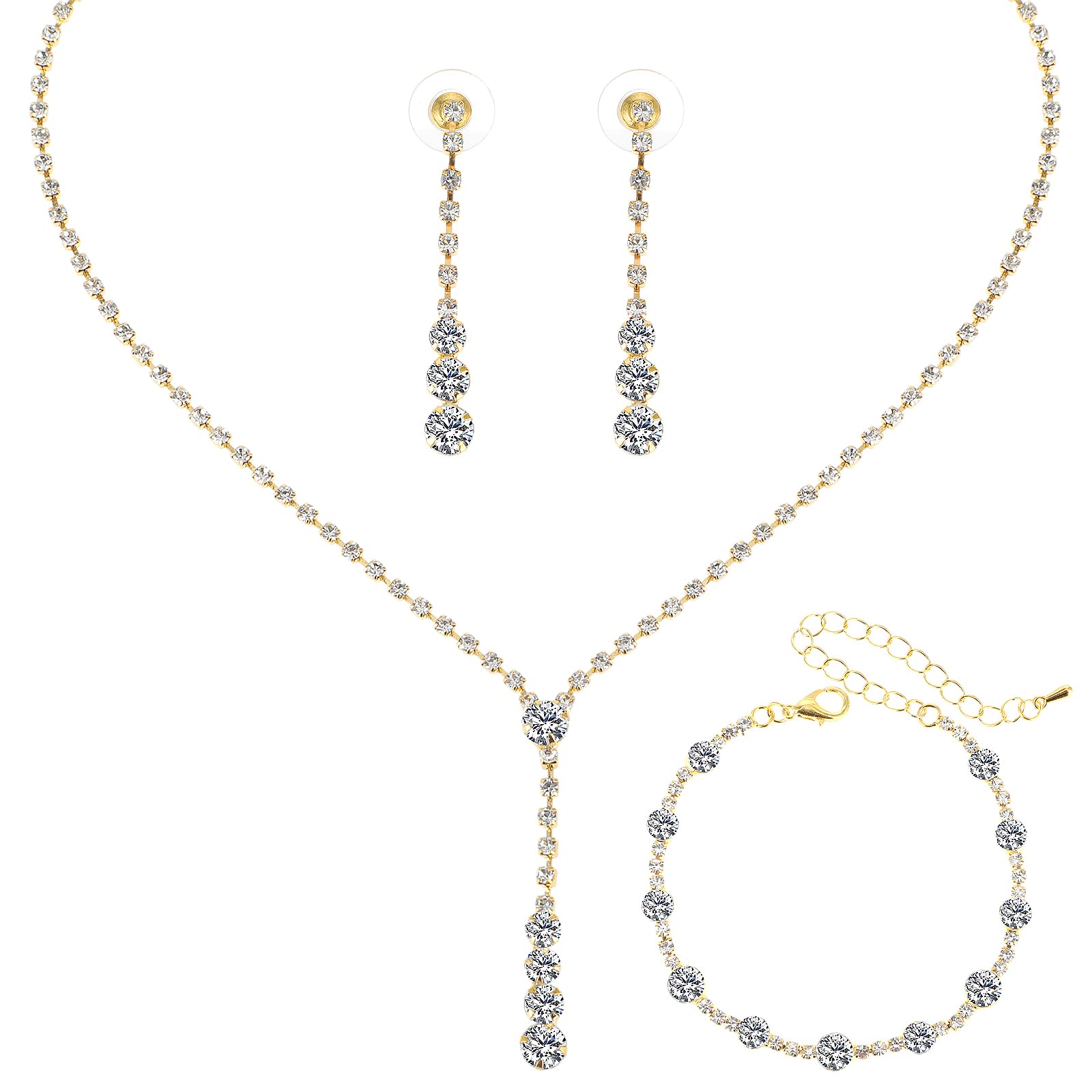 The choker necklace features delicate rhinestones that will catch the light beautifully in photos. Matching bracelet and stud earrings complete the polished look.