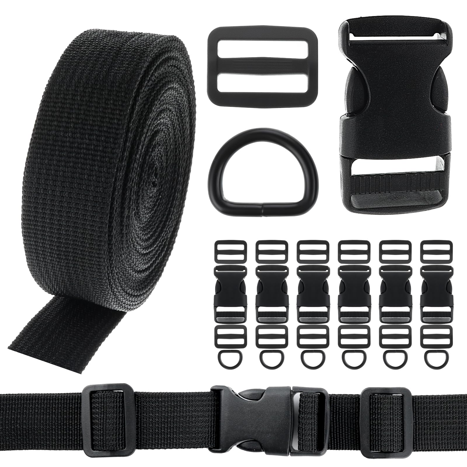Buckle Straps 1Inch Set Black Nylon Webbing Straps 6Pcs Plastic Quick Side Release Buckle Double Adjustable Straps 12Pcs Tri-glide Slide Clip 6Pcs Metal D Rings for Luggage Strap Backpack Replacement