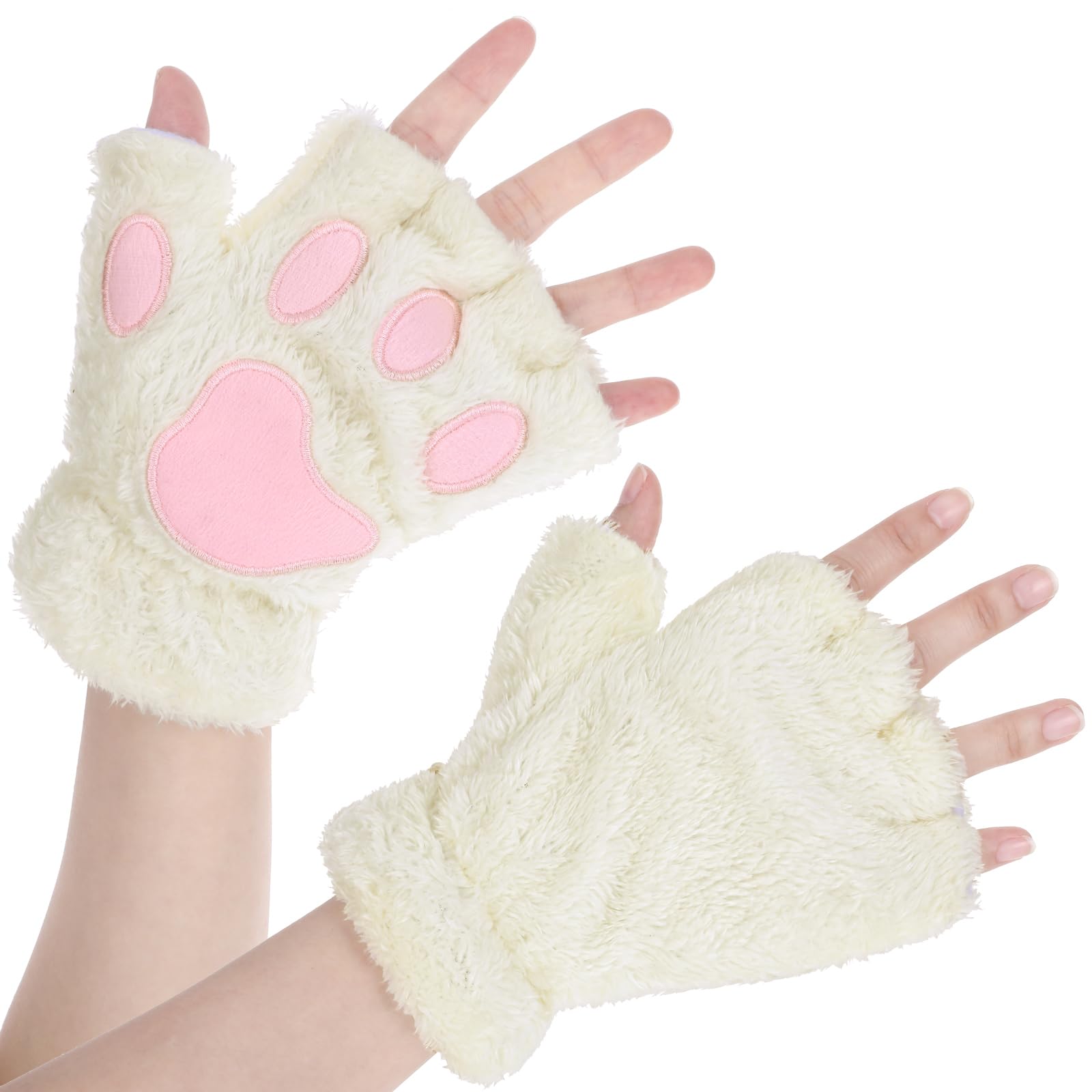 Cat Paw Gloves Kawaii Fingerless Gloves for Women Winter Furry Cat Gloves Cute Faux Fur Plush Half Finger Paws Gloves for Girls Women Halloween Cosplay Costume Accessories