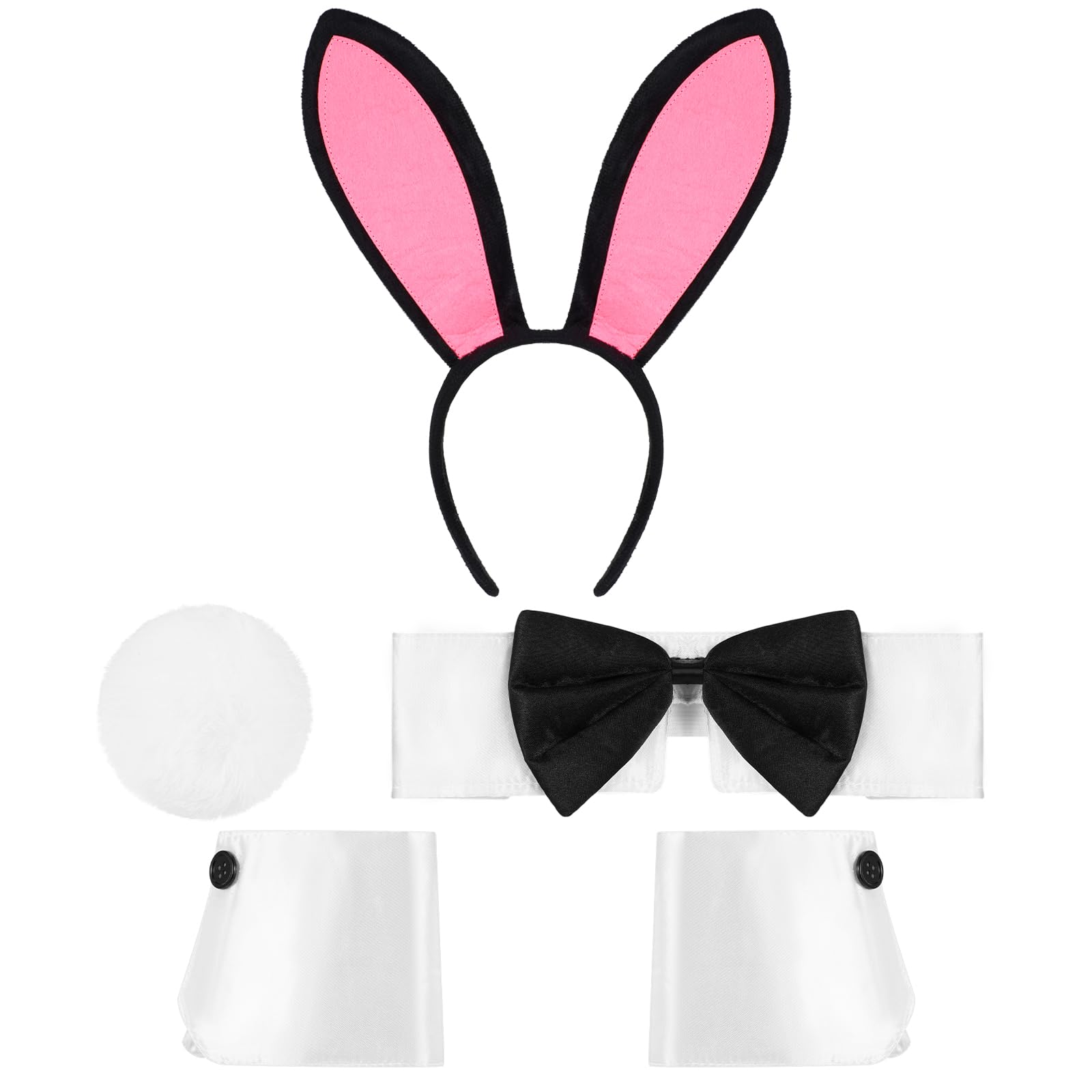 DIVINA VITAE Bunny Costume Set Rabbit Ears Headband Collar Bow Tie Costume Cuffs Rabbit Tail Accessories for Easter Halloween Cosplay Party (Black and Pink)
