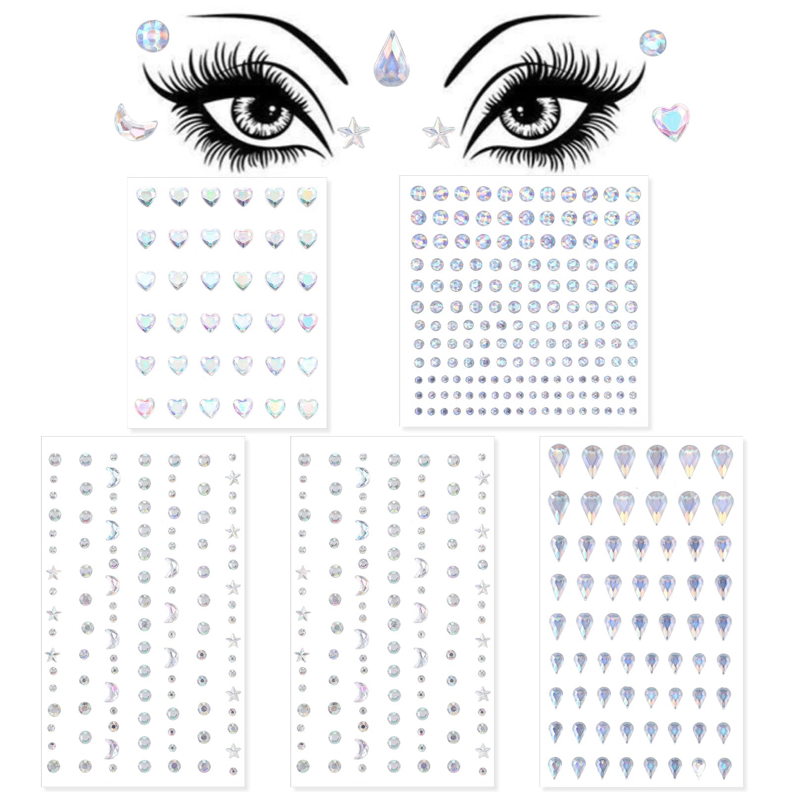 Face Gems Face Jewels Stickers 5 Sheets Face Rhinestones Stick on Sparkle Self Adhesive Eye Body Gems Hair Rhinestones Crystal for Women Fairy Makeup Decorations Rave Halloween