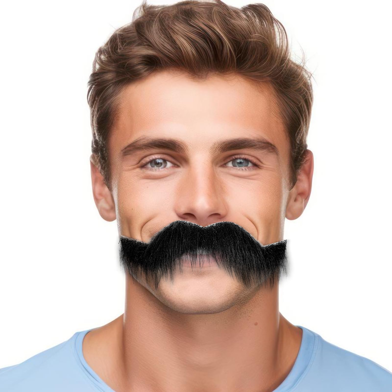 The size of fake mustache is similar to the real fake mustach, which can provide a more realistic appearance and enhance the realism of the character.