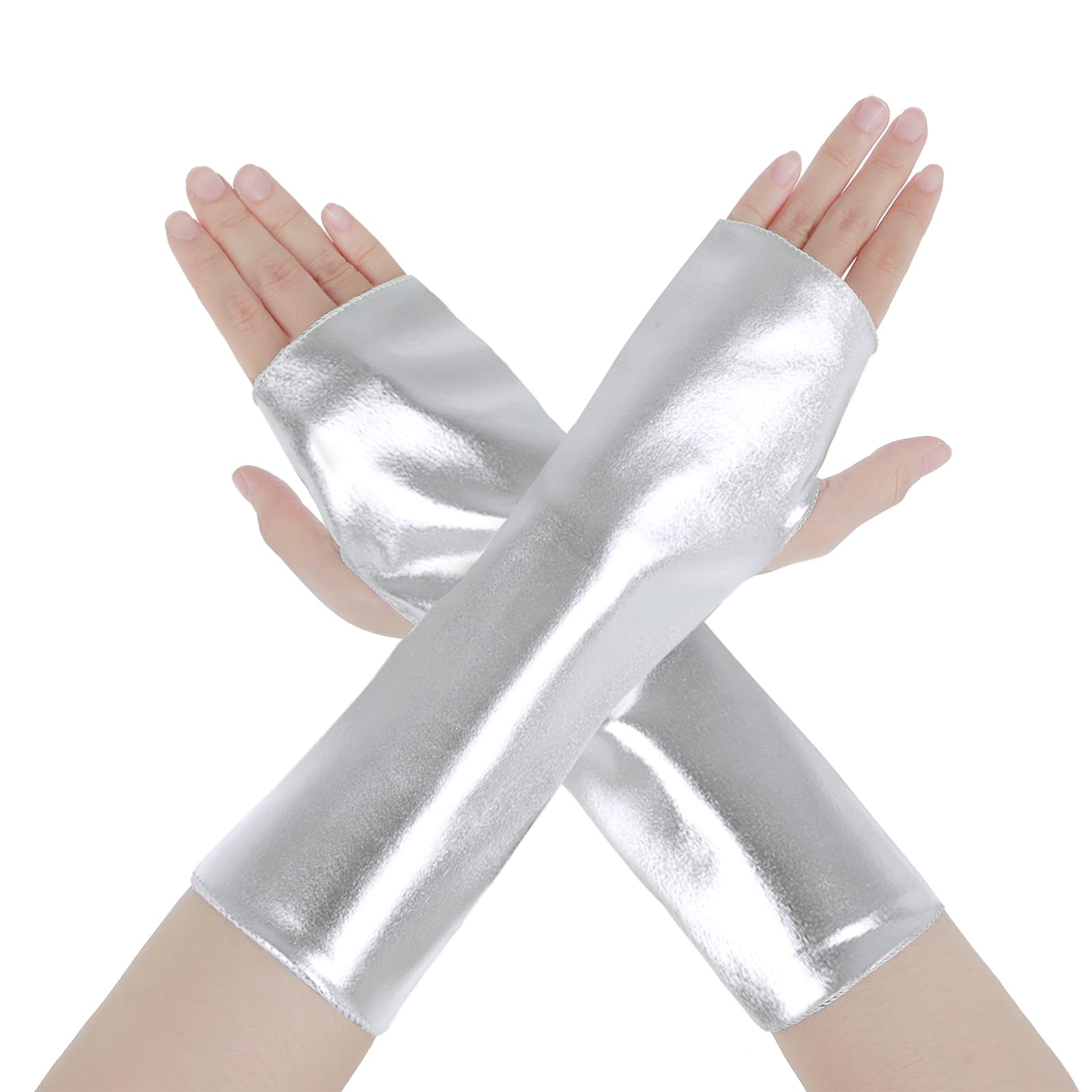 Fingerless Gloves 9 In Leather Goth Arm Warmers Cosplay Long Silver Gloves Gothic Punk Rock Stage Arm Sleeves for Women and Girls