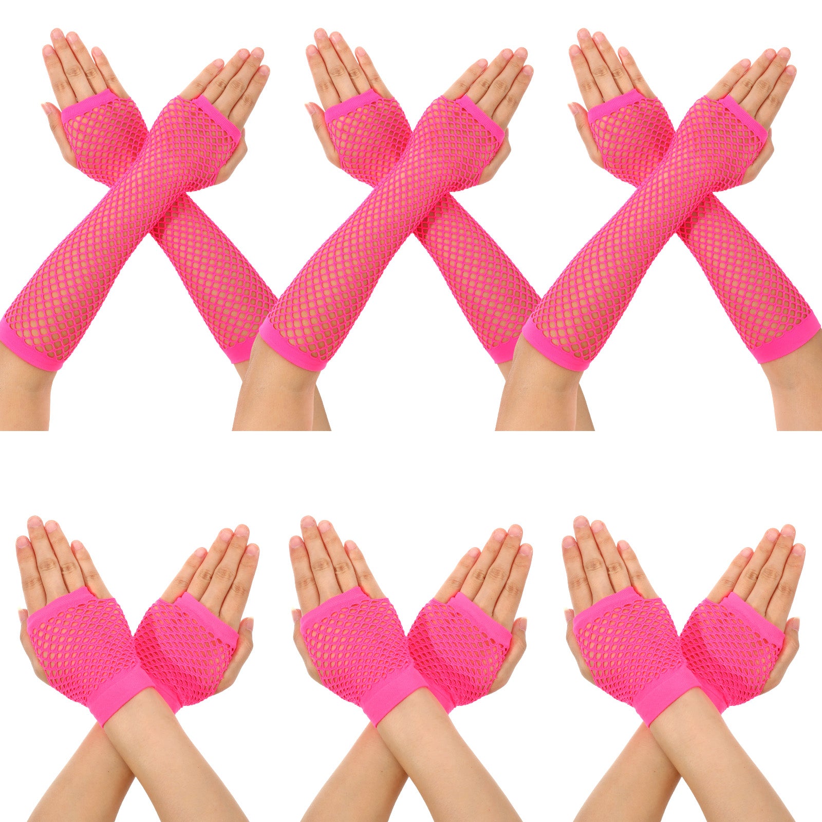 Fishnet Gloves, 6 Pairs Fingerless Fish Net Gloves for Women, Long and Short Stretch Retro Arm Sleeves Halloween Outfit(Rose Red)