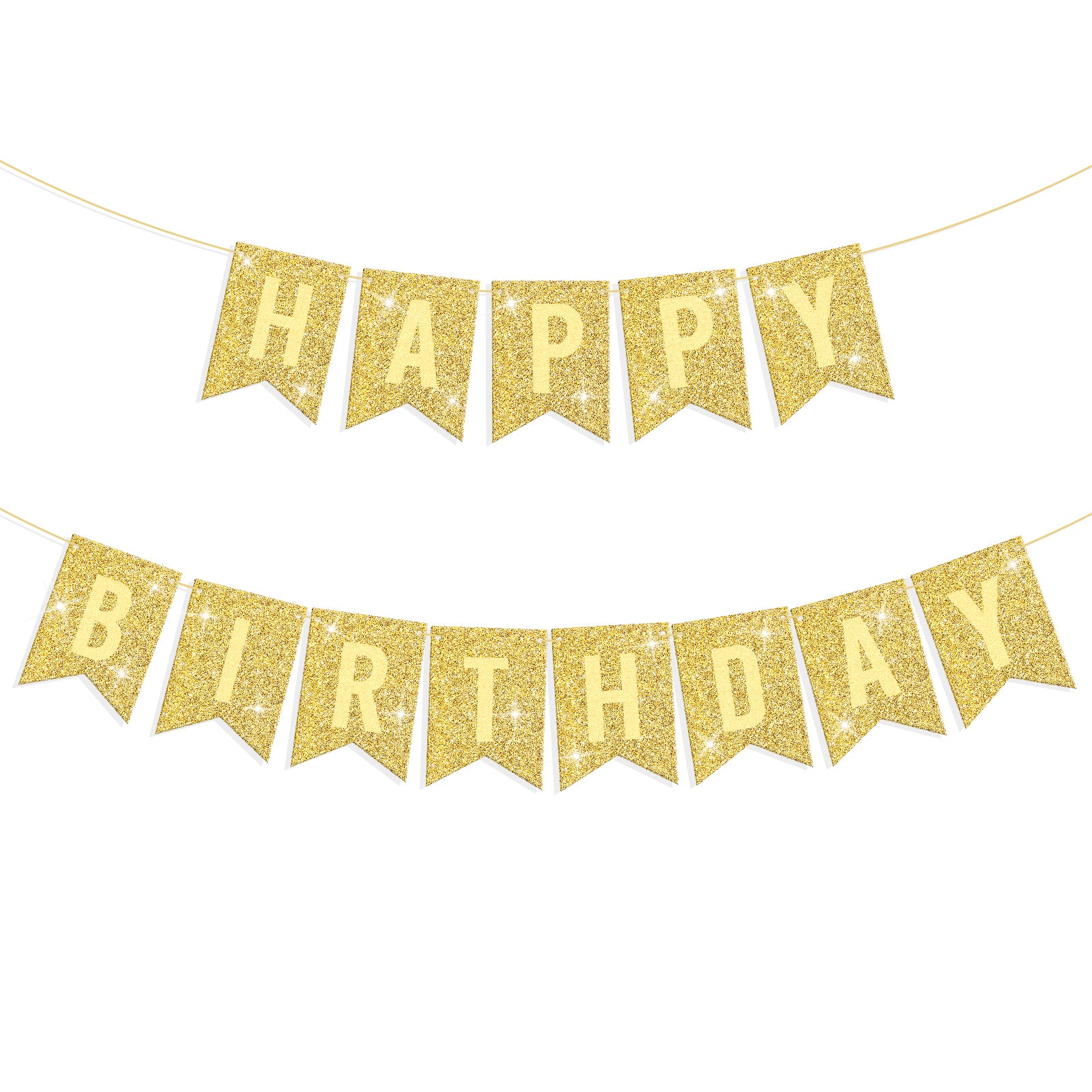 Gold Happy Birthday Banner Decorations, Pre-Strung Glitter Birthday Party Banner Sign, Happy Birth day Sign Decor for Women Men Party Supplies