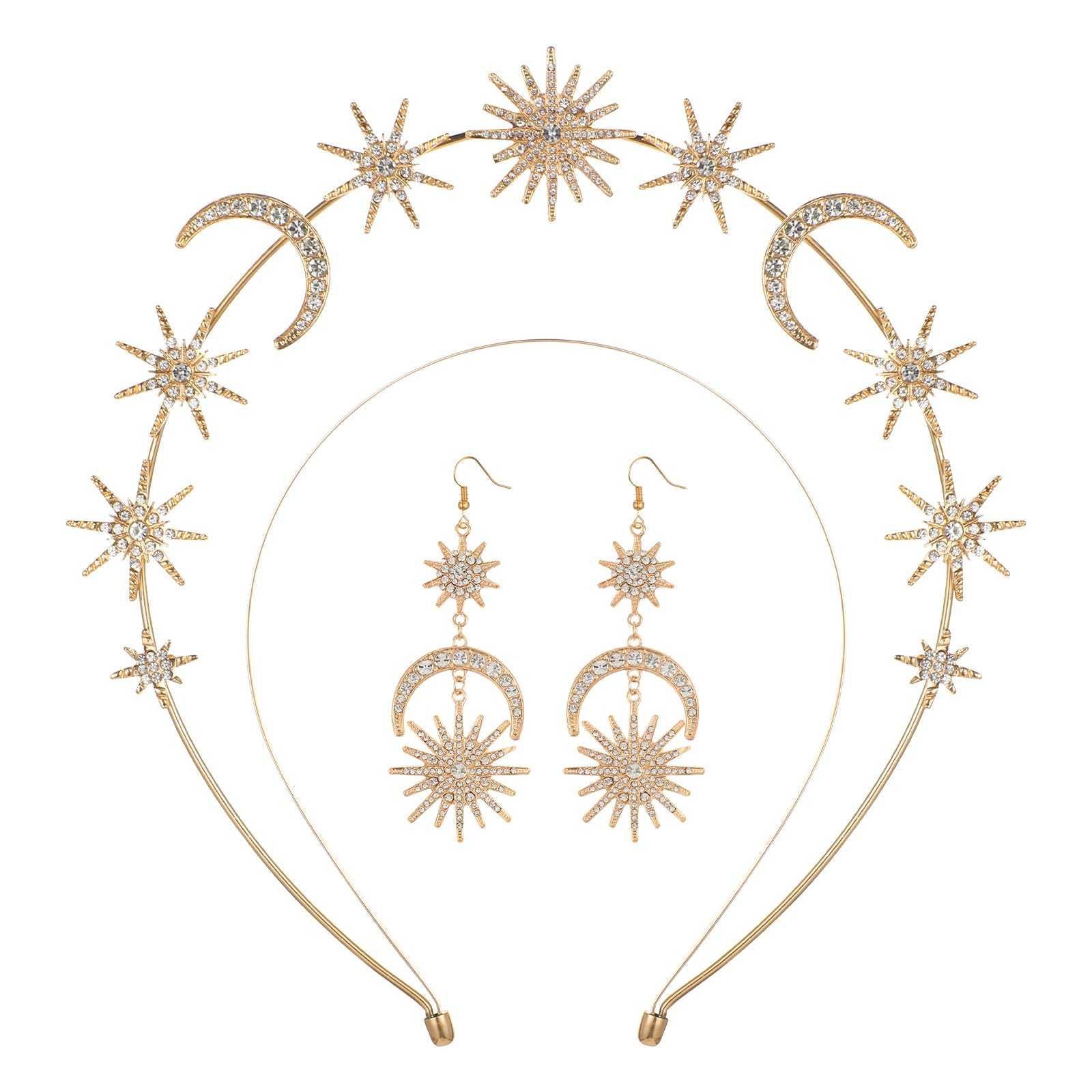 Star and moon halo crown set, decorated with star and moon motifs, embellished with sparkling rhinestones, made of alloy crystal, comfortable to wear, contains exquisite hair bands and earrings, perfect gift to convey your blessings.