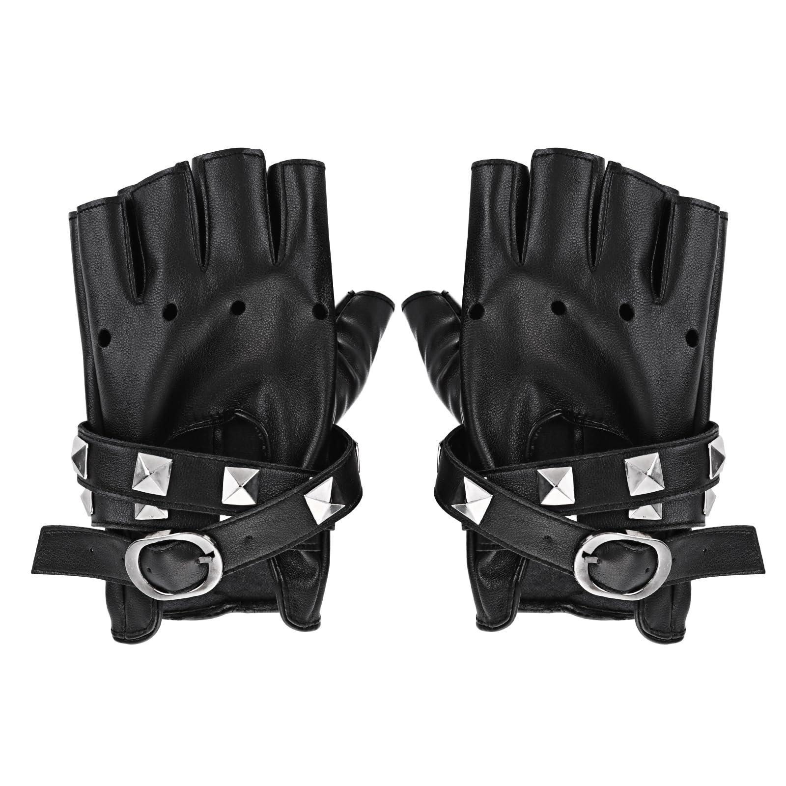 HaiFafafaing Leather Black Fingerless Gloves, Black Punk Gloves for Women Driving, Cycling, Sports, Cosplay, Performance, Halloween