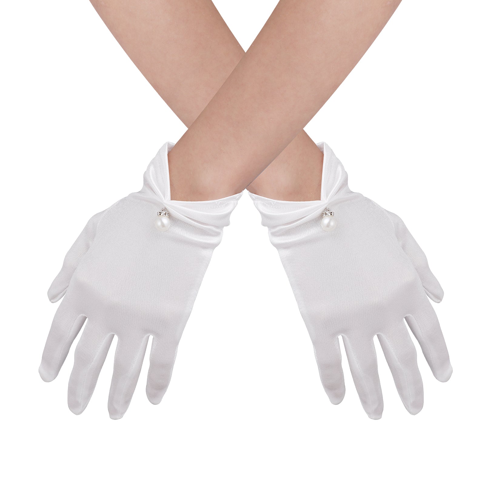 HaiFafafaing Short Satin Gloves White Gloves Women Wrist Length Satin Wedding Gloves 1920s Pearl Bridal Gloves Banquet Opera Tea Party Tuxedo Uniform dress gloves for Women and Girls (White)