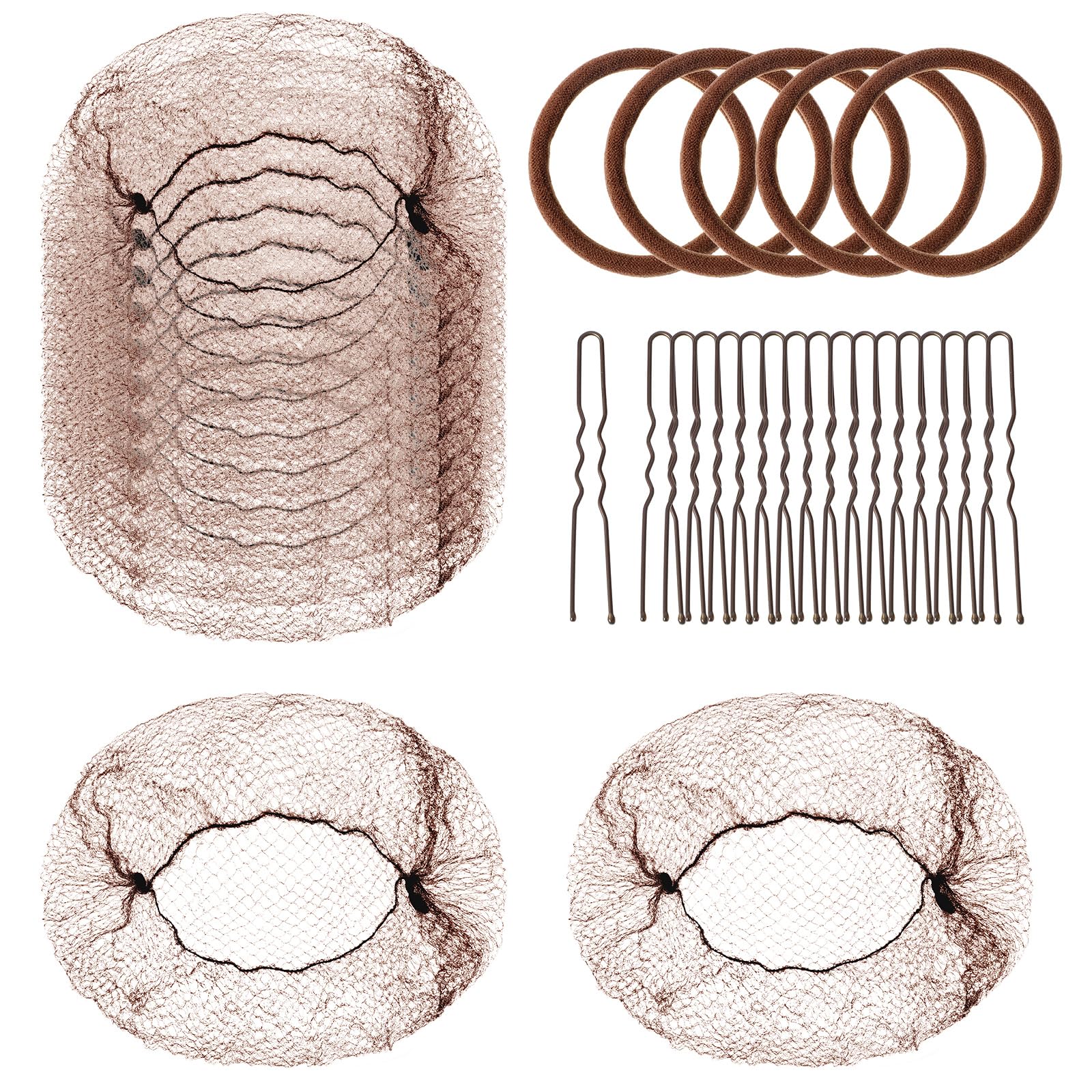 Hair Nets for Buns 30PCS Invisible Hair Net with 40PCS U Shaped Hair Pins and 5PCS Hair Elastic Bands,Brown Tulle hair net for Women, Nurse, Ballet Bun Maker Dance (Brown)