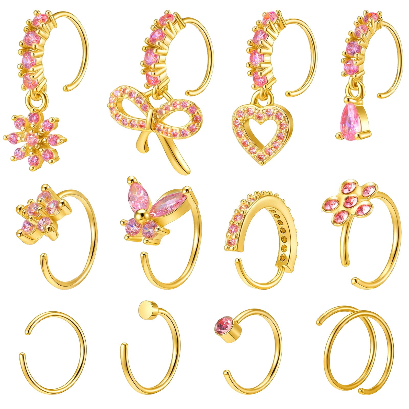 HekouJiub 12Pcs Nose Rings Hoops for Women 20G Gold Plated Nose Rings with Heart Butterfly Flower Bow CZ Charms Women Body Piercing Jewelry