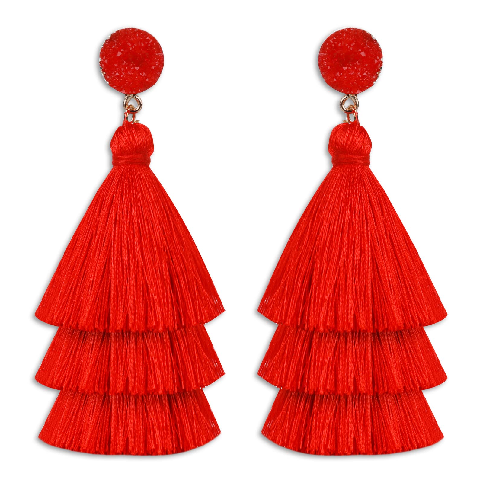 Layered Tassel Earrings Bohemian Tiered Tassel Thread Earrings Fringe Dangle Drop Earrings for Women Teen Girls (Red)