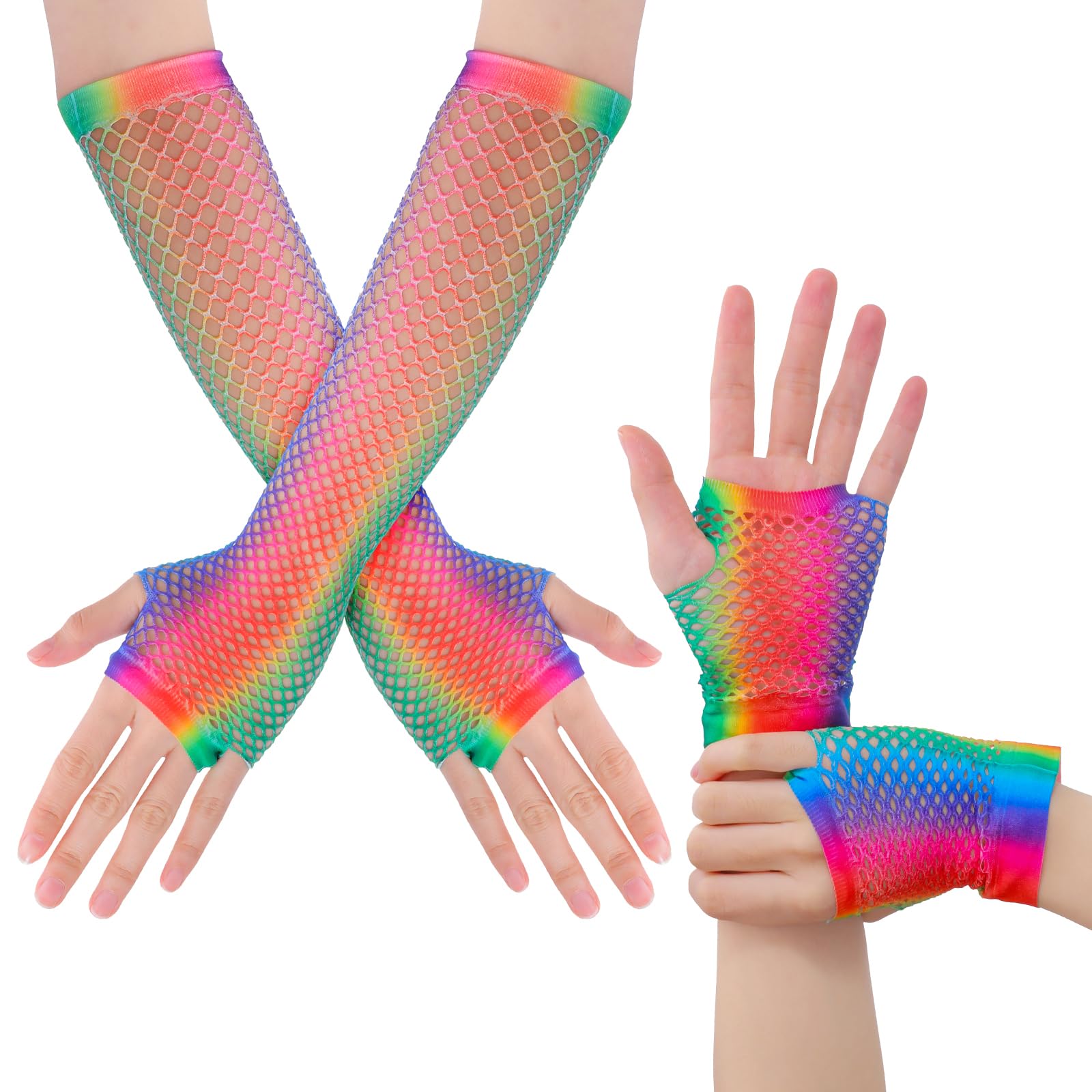 Lusofie 2 Pairs Rainbow Fingerless Gloves Long Fishnet Mesh Gloves 80s 90s Accessories for Women Short Fishnet Gloves Rave Accessories Cosplay Costume Rainbow Accessories for Party