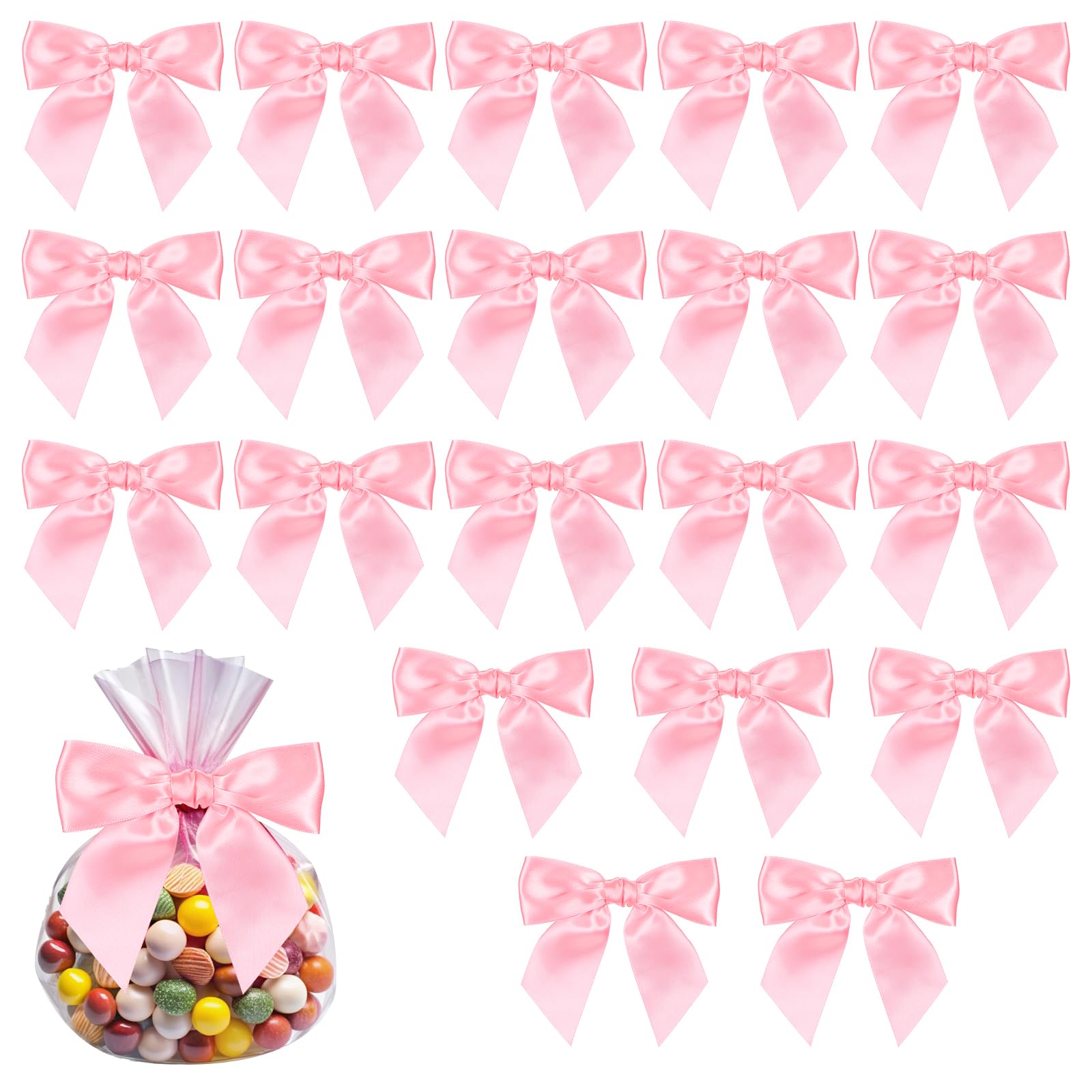 You will get 20 pieces of 11.5cm pink satin bows for crafts made of polyester ribbon with 15cm transparent twist tie, which is easy to use and durable, suitable for a variety of decoration and packaging needs, such as party gift bags, candy boxes, special event bags and cakes, crafts, clothing and other occasions.
