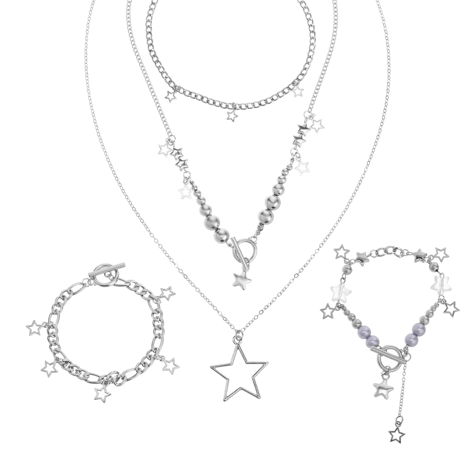 Lusofie 3 Pcs Layered Necklace Silver Star Necklaces Y2k Necklace 2 Pcs Star Bracelets Gothic Jewelry Y2k Jewelry Set Layered Silver Necklaces for Women