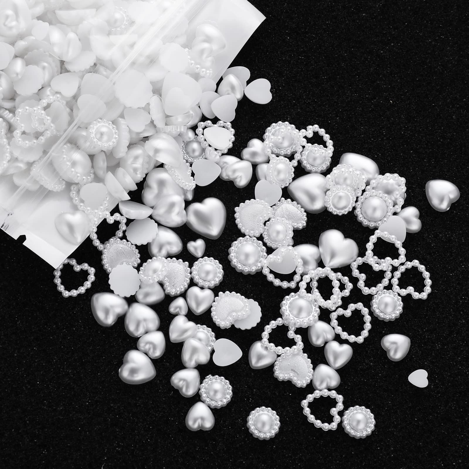 Lusofie 500Pcs White Pearls Heart Nail Charms, 3D Nail Charms Pearls Heart Beads Embellishments DIY Crafts for Nail Art Accessories Rhinestones