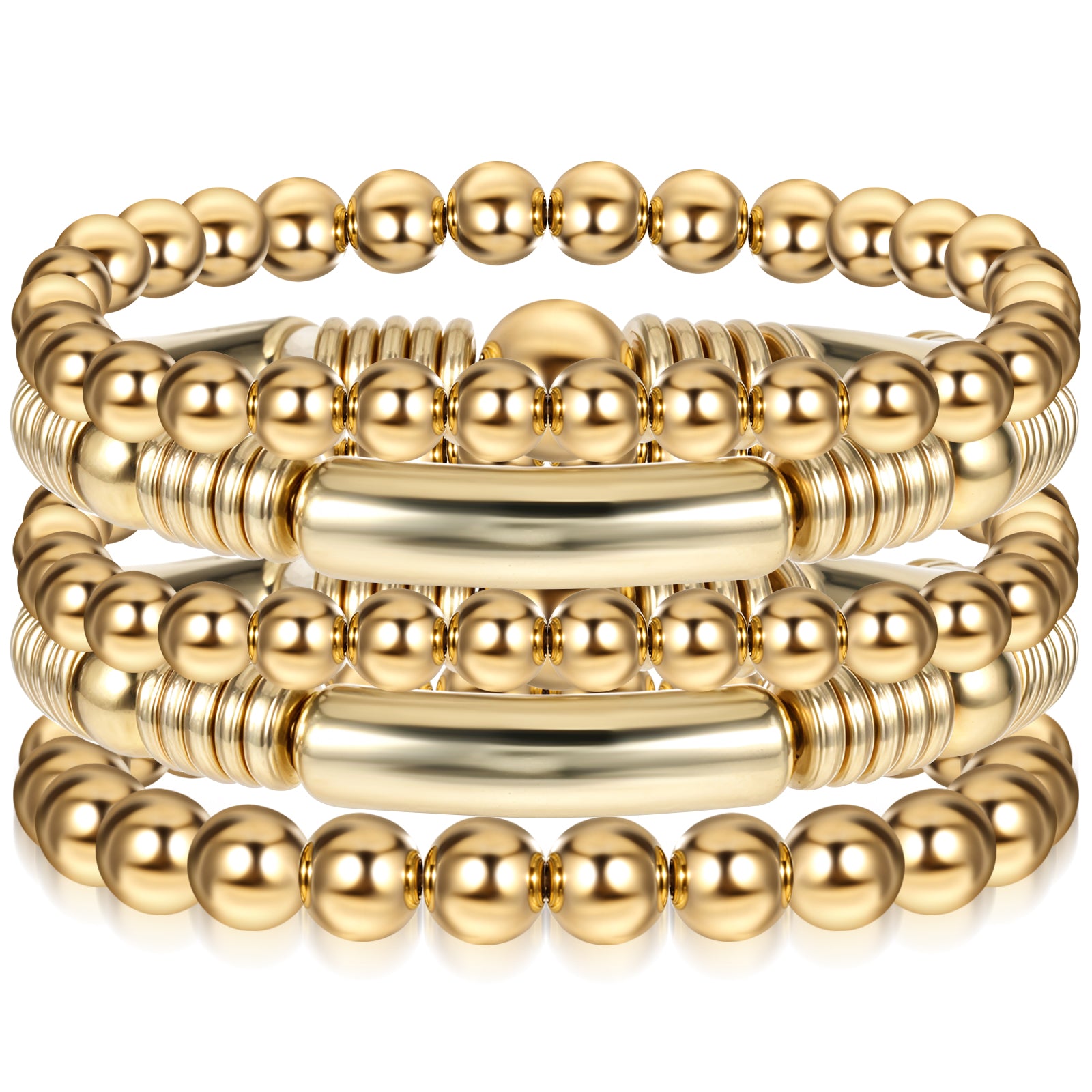 This handmade gold beaded bracelets contains 5 pieces of various simple designs, suitable for multiple occasions, moderate stretch and hypoallergenic, can be worn alone or stacked to show your personal charm.