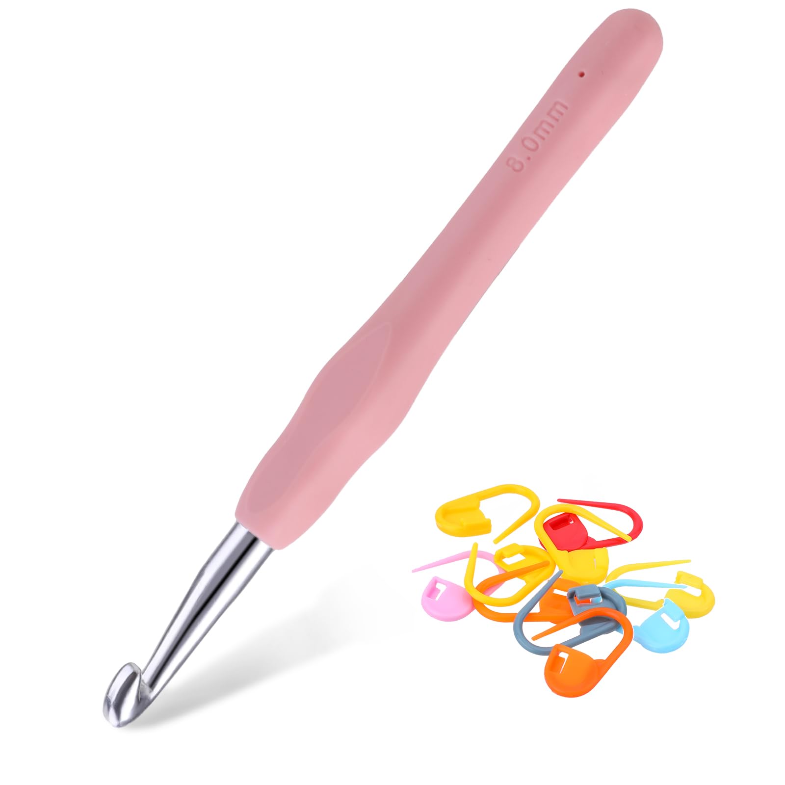Lusofie Crochet Hook, 8mm, Aluminum, Ergonomic Soft Grip, Long Hook with 10pcs Stitch Markers, for Arthritic Hands Beginners and Lovers