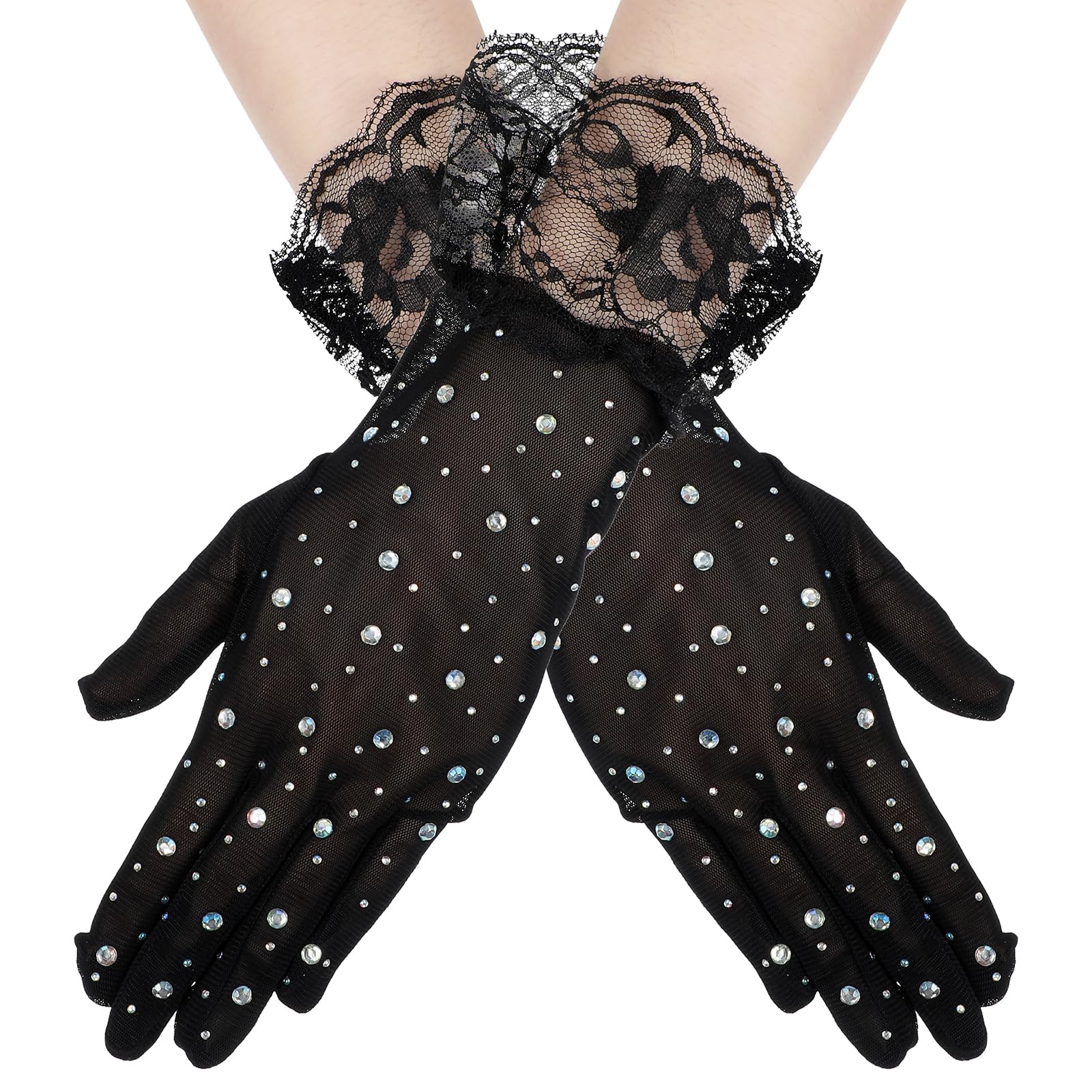 Lusofie Lace Gloves for Women with Glitter Rhinestones 1920s Elegant Opera Gloves Short Mesh Gloves for Wedding Dinner Tea Party Cosplay(Black)