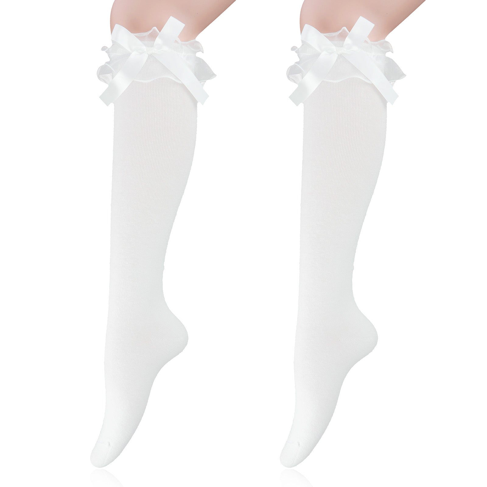 Lusofie Lace Knee High Socks with Bow Cute White Knee High Socks For Women Girl with Lace Ruffle Trim for Loli Clothing Accessories