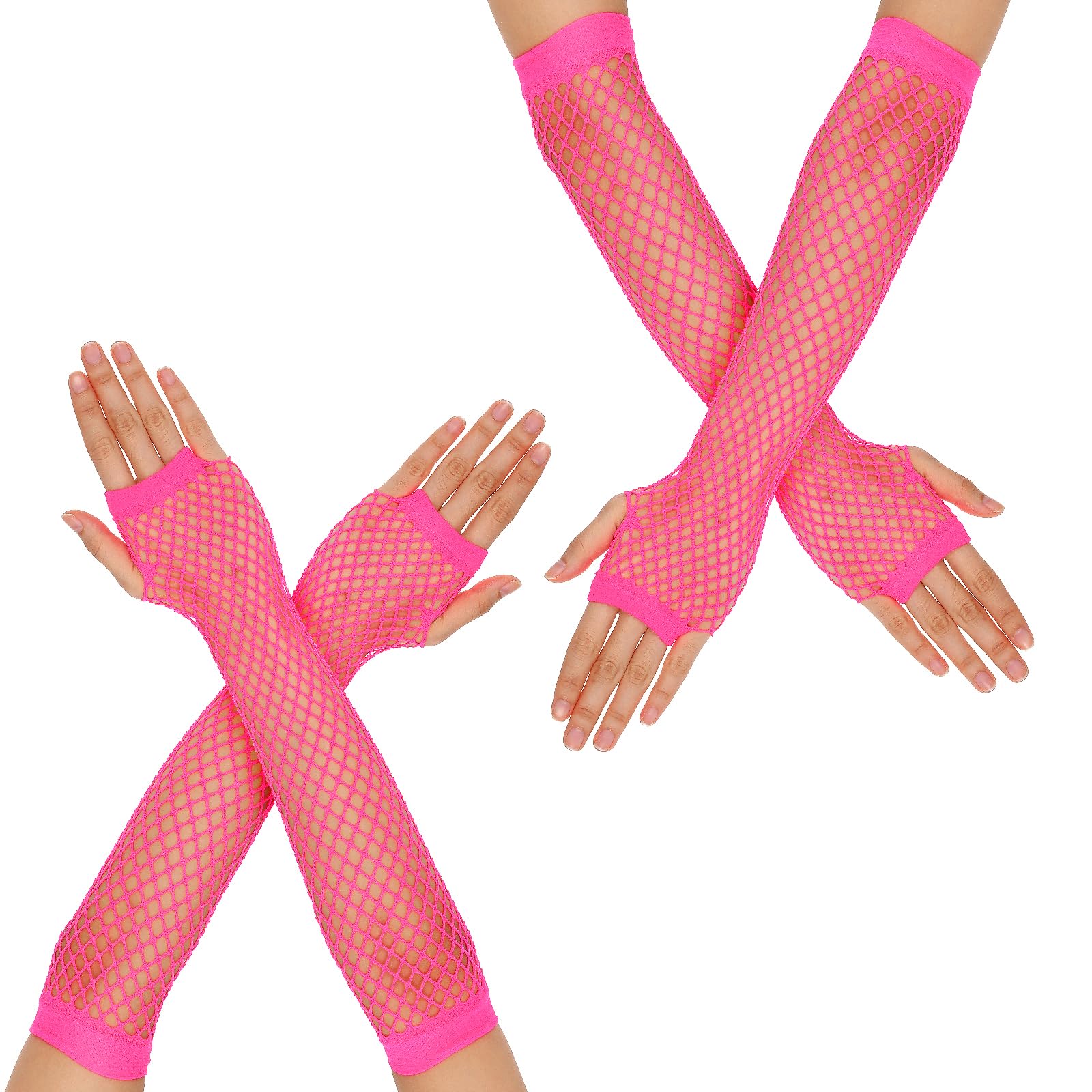 Lusofie Pink Fishnet Gloves 2 Pairs Fingerless Long Mesh Gloves for Women Fishnet Arm Sleeves for Theme Party Cosplay Costume Accessories(Rose Red/Fluorescent Green/Black) (Rose red)