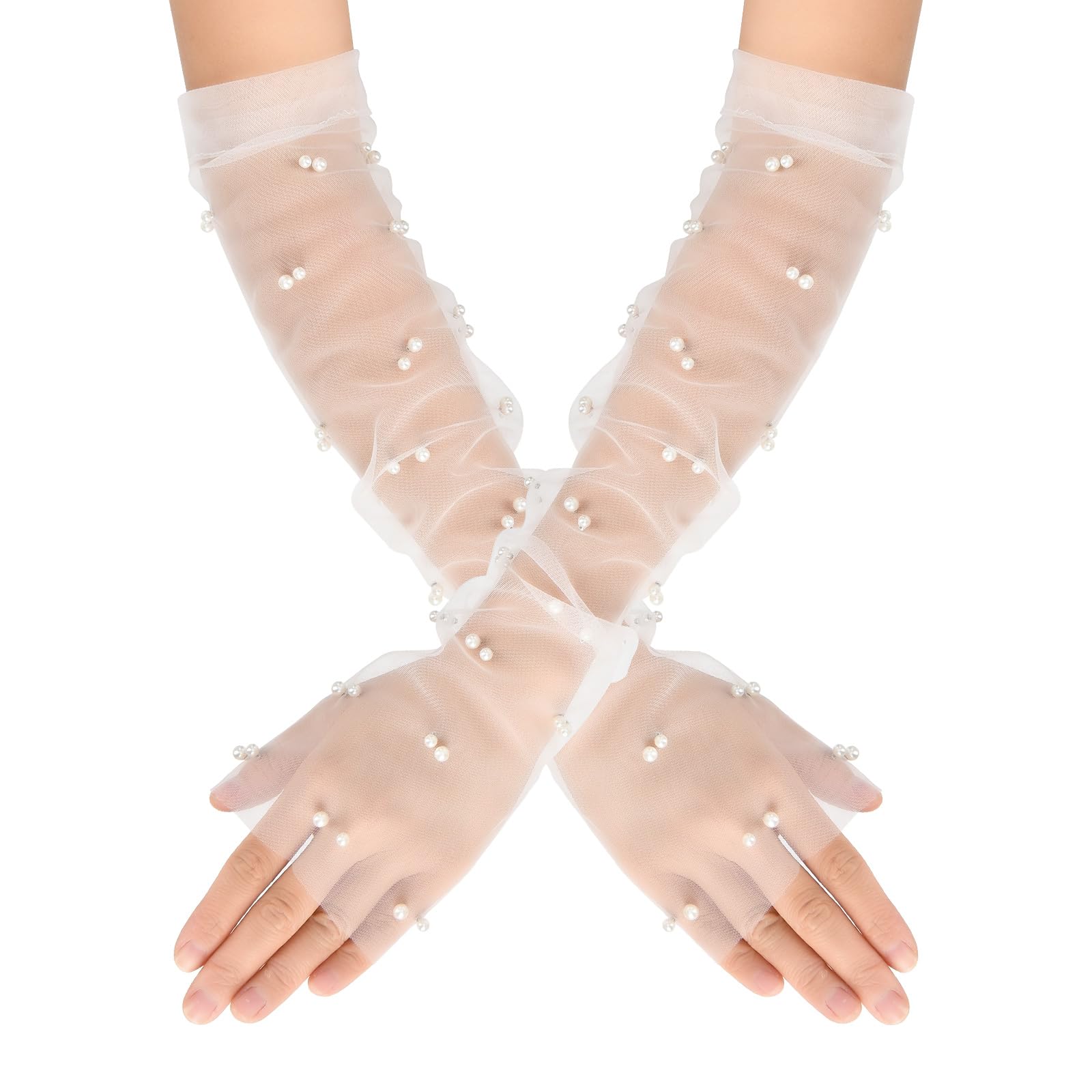 Lusofie White Tulle Gloves Fingerless Sheer Gloves with Pearls Sheer Long Gloves Bridal Gloves for Women Wedding Tea Party Hallowmas Cosplay Accessory