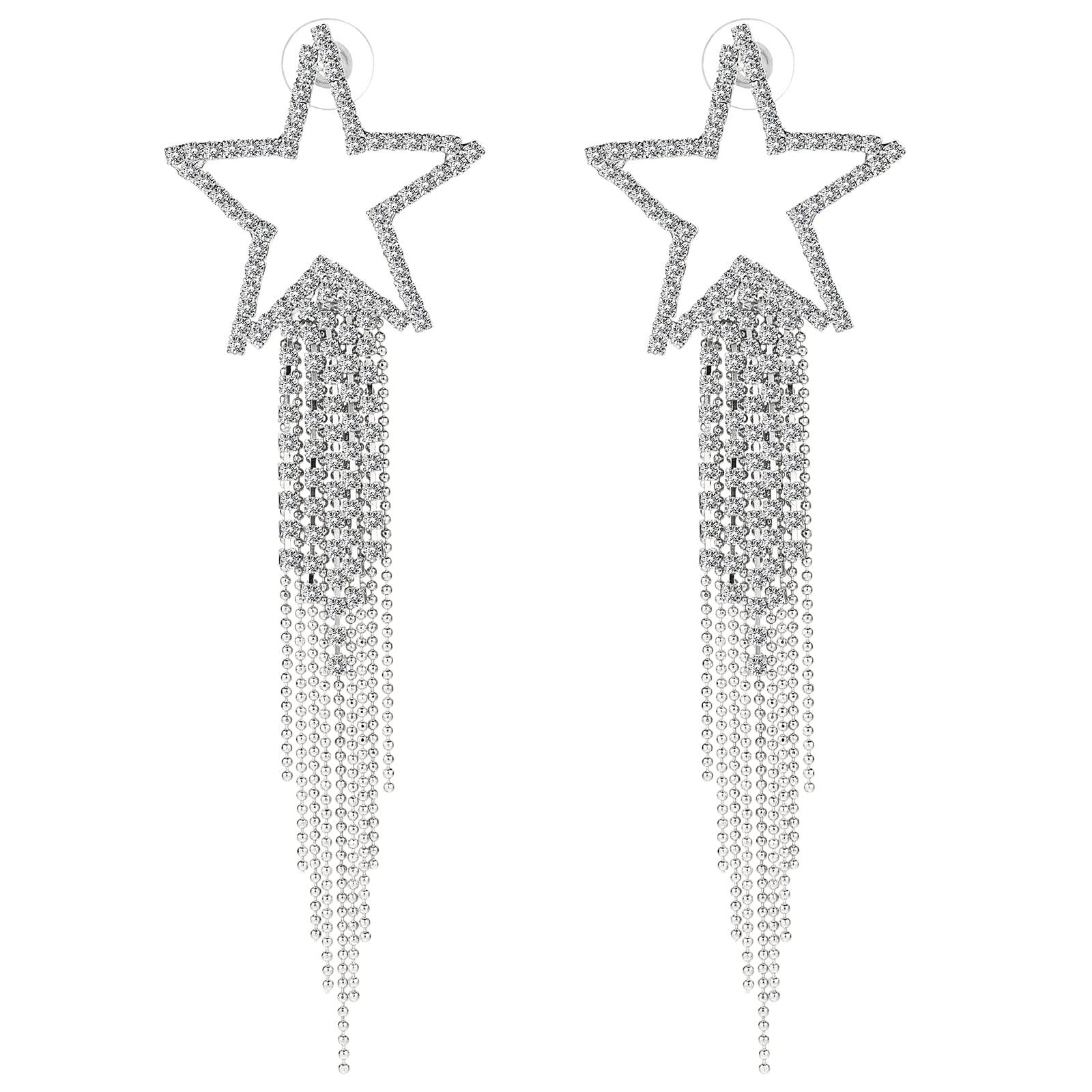 Lusofie Women’s Tassel Earrings Star Ear Stud Pave Crystal Dangle Earrings Rhinestone Fringe Chain Earring Bridal Jewellery Silver Tassel Drop Dangle Earrings Crystal Statement Dangle Earrings