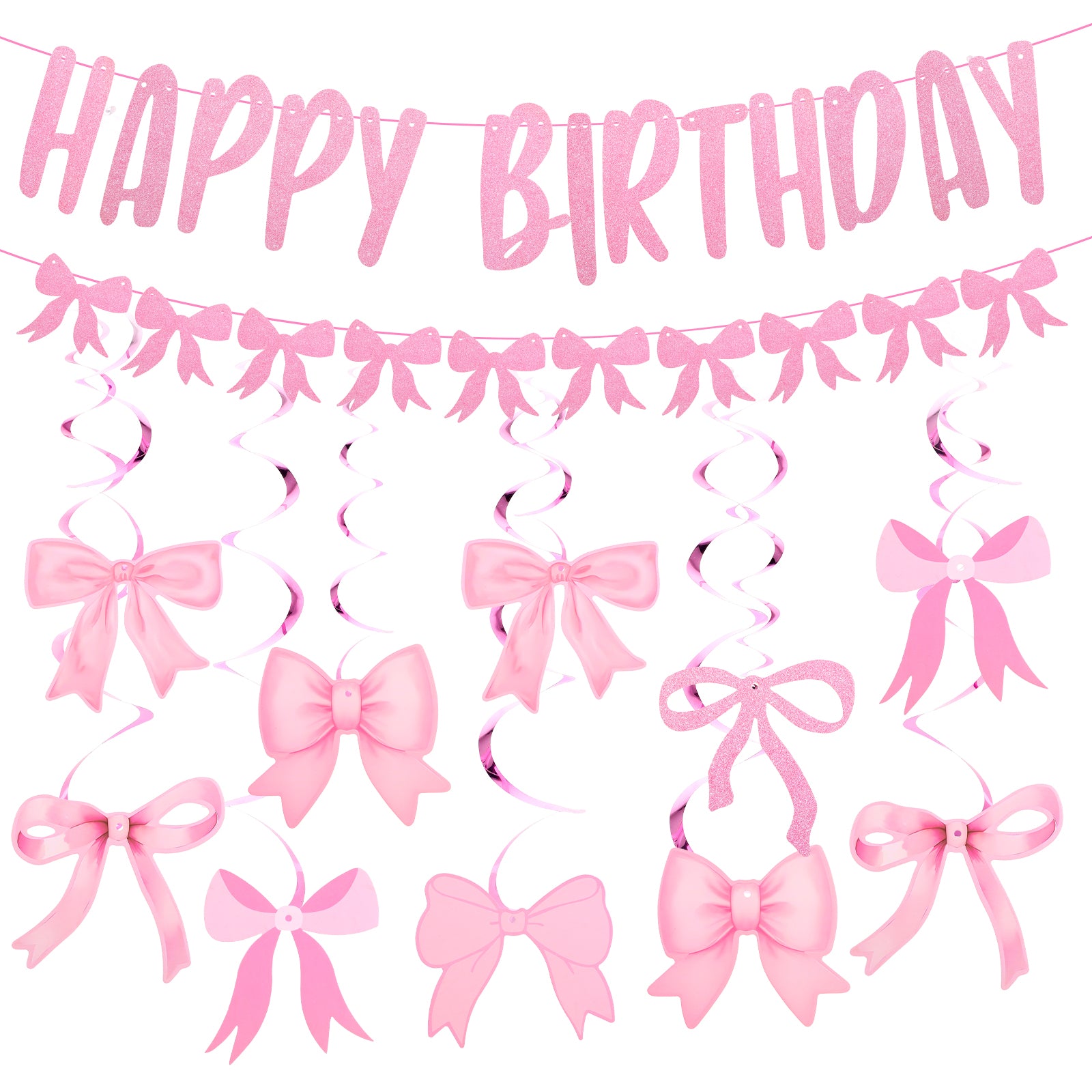 Pink Birthday Decorations for Girls and Women Cute Happy Birthday Banner with Hanging Swirls Pink Party Decorations (2 Banners + 14 Bow Hanging Swirls)