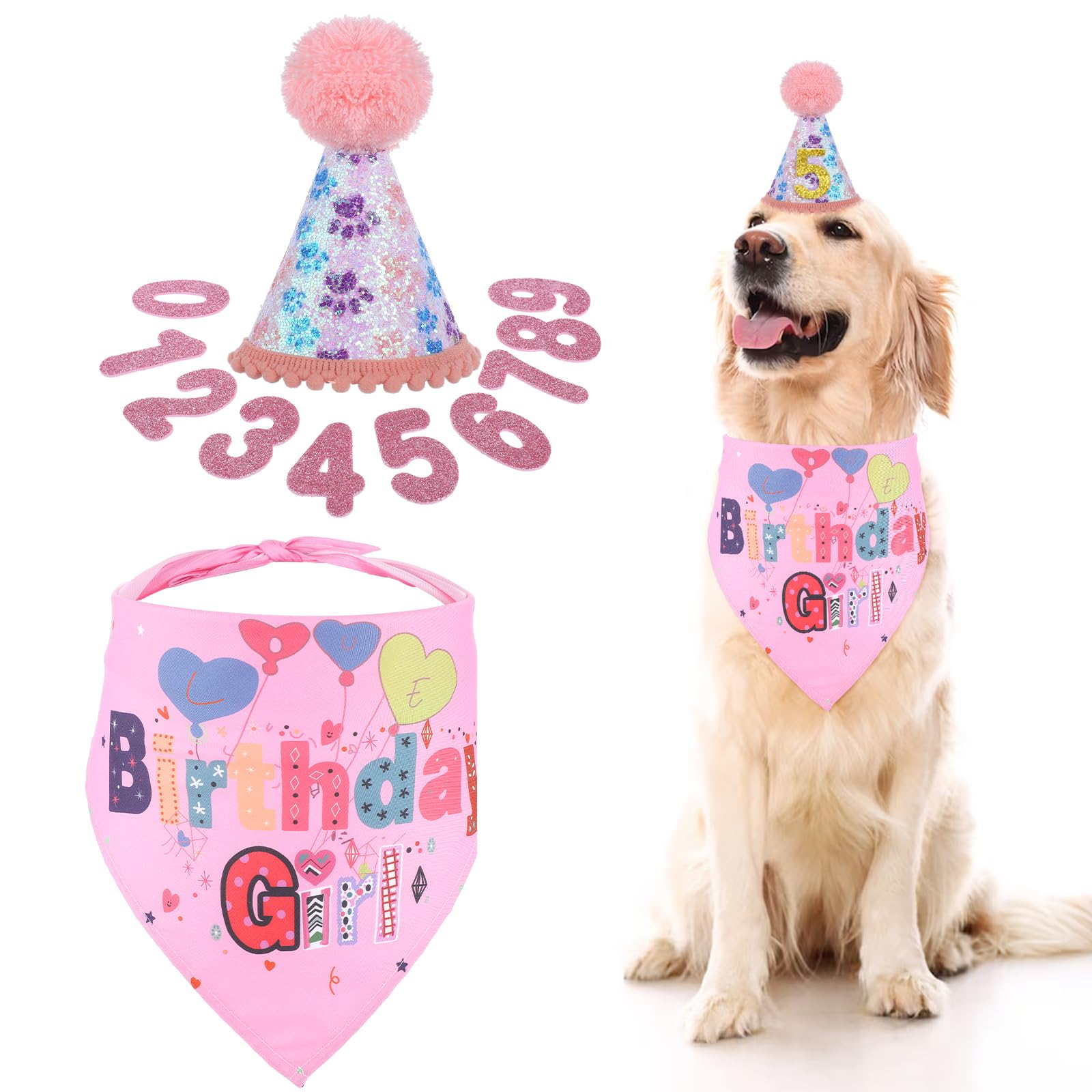 Pink Dog Birthday Bandana Girl,Dog Birthday Party Supplies with Dog Birthday Hat Dog Birthday Decorations Set with Numbers for Large Medium Small Dogs Pet Supplies