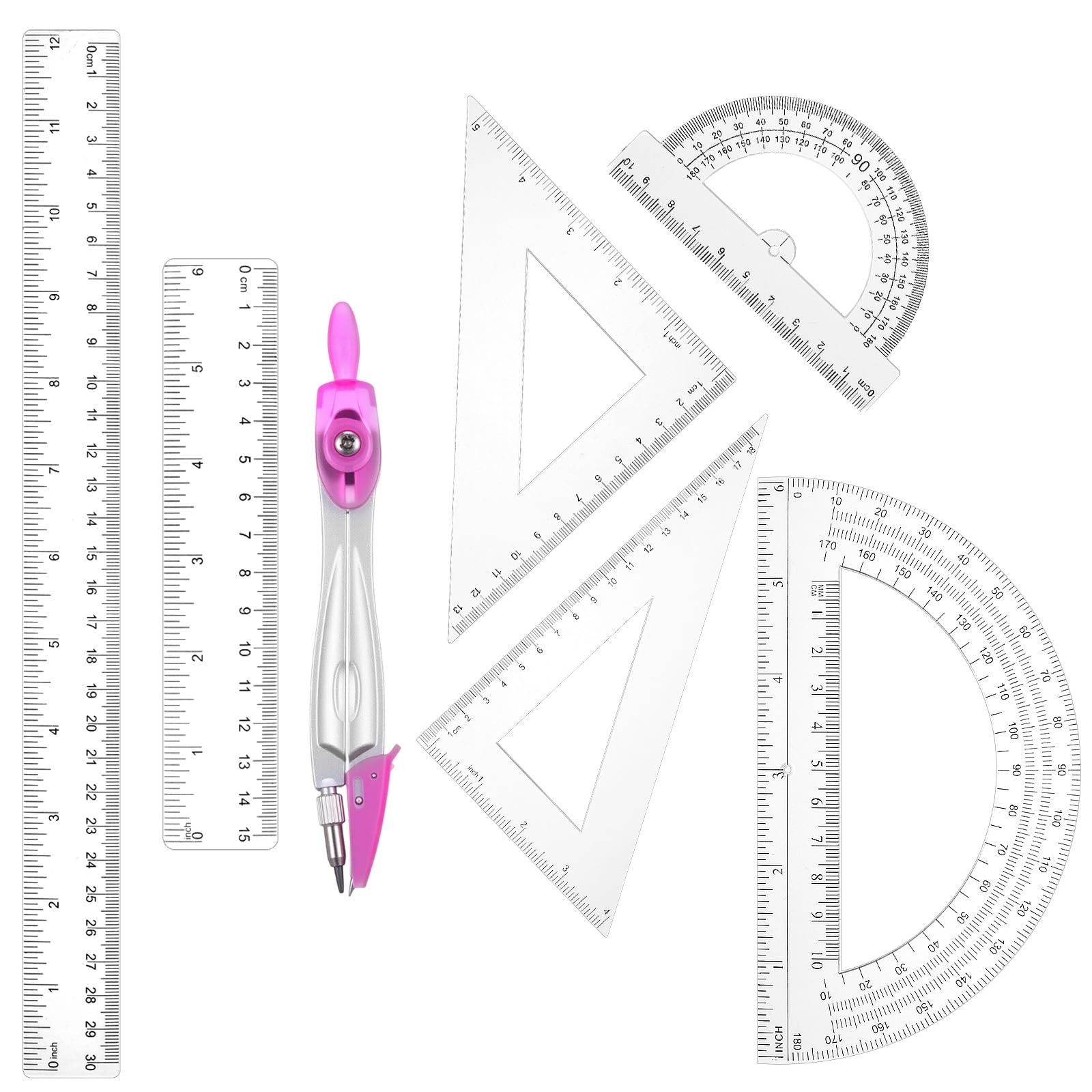 Plastic Ruler Set, Transparent Geometry Math Set Includes Drawing Compass, 12/6 Inch Straight Protractor,45/60 Degree Triangle Rulers, 6/4 Inch Protractor for School Office Home Supplies
