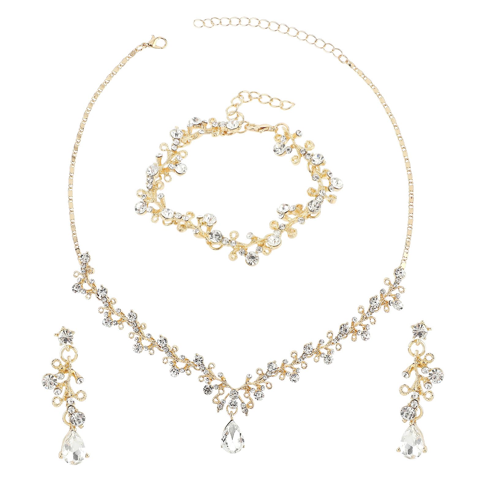 Rhinestone Bridal Wedding Jewelry Sets Gold Jewelry Set for Women Crystal Necklace Bracelet Earrings Set for Brides Bridemaid Prom Costume Accessories
