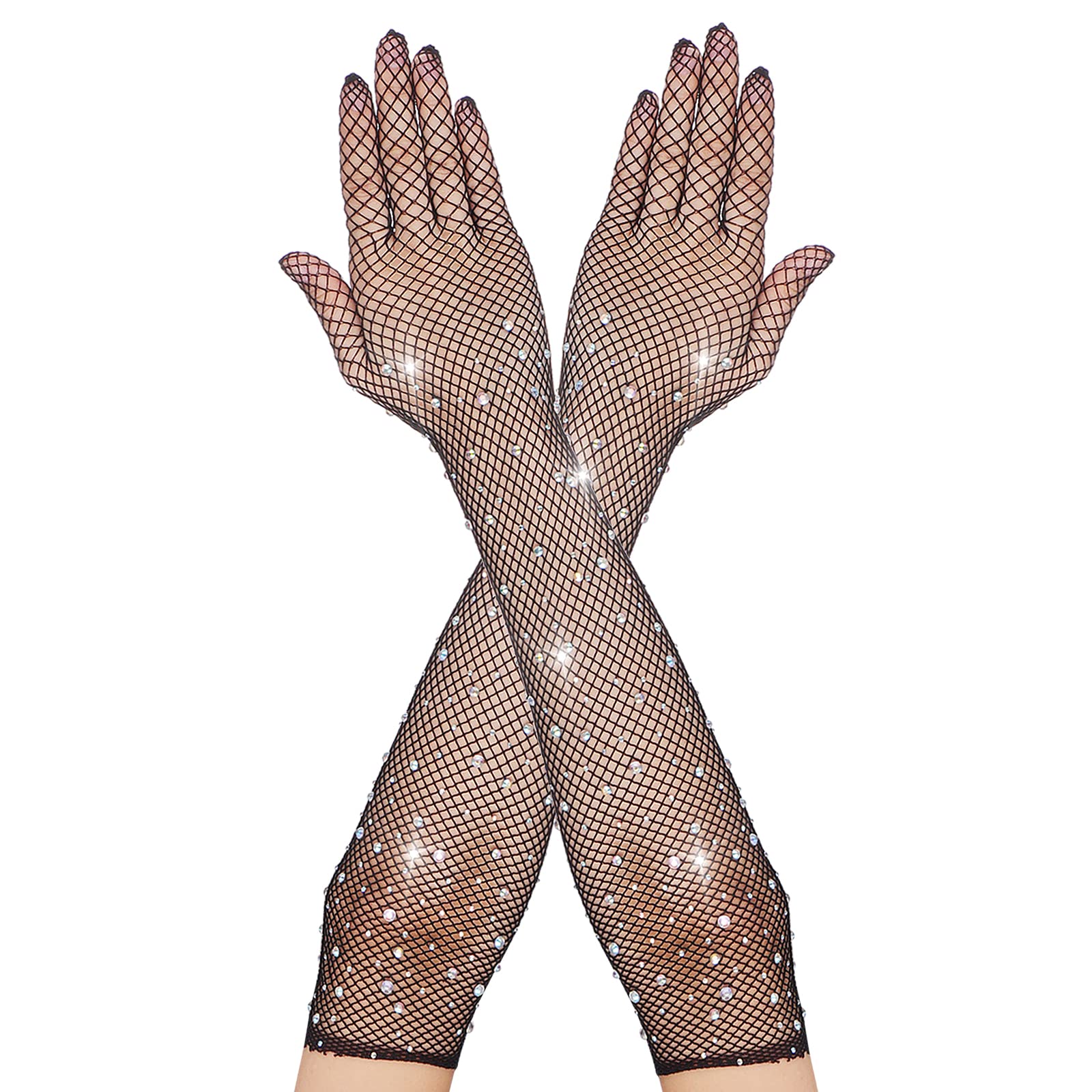 Rhinestones Long Fishnet Gloves Fish Net Gloves Full Finger Long Gloves for Women Mesh Glove for Evening Party (Black)