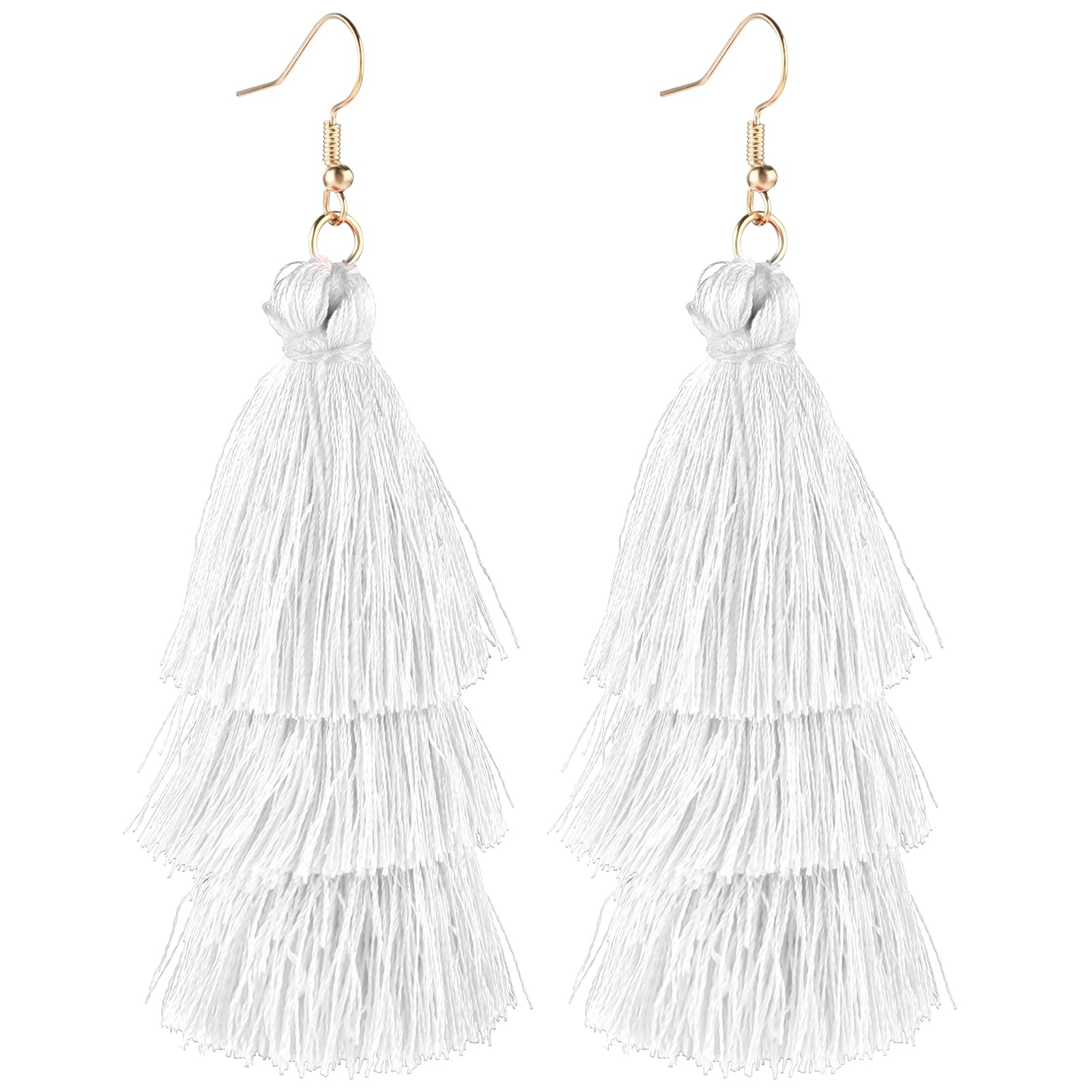 Tassel Earrings For Women Long Thread Tassel Earrings Bohemian Fringe Drop Handmade Earrings for Women Girls (White)