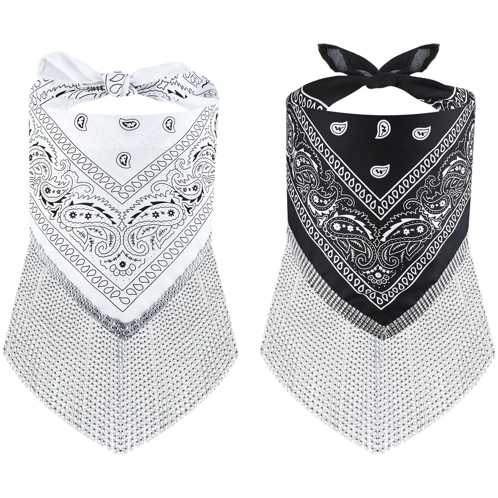 Telooco 2 Pcs Disco Fringed Rhinestone Bandana Bachelorette Sparkly Bandanas Disco Party Favor Cowgirl Outfit Accessories for Women (Black and White)