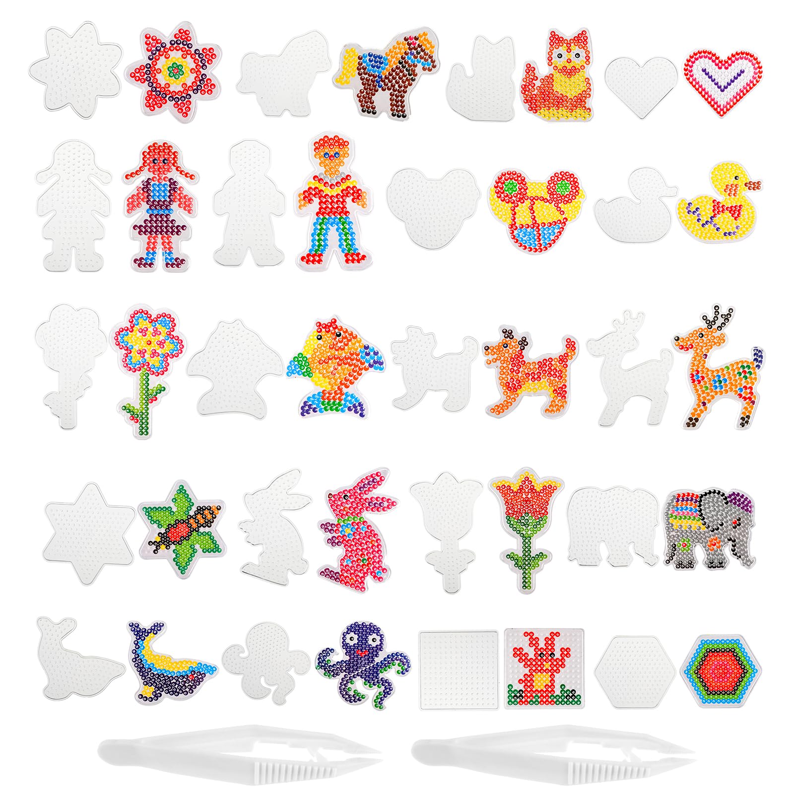 Telooco 20Pcs Beads Boards 5mm Clear Animal Shape Pegboards Plastic Bead Boards Craft Tray with 20 Pattern Template Paper Cards for Ironing Bead DIY Supplies Comes with 2 Tweezers