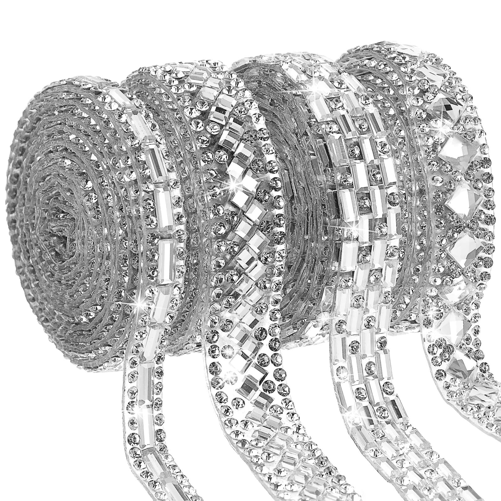 Telooco 4 Rolls Self Adhesive Rhinestone Ribbons 4 Sizes Silver Diamond Crystal Glitter Stickers for DIY Art Crafts Car Phone Mirror Decoration (4 Yards)