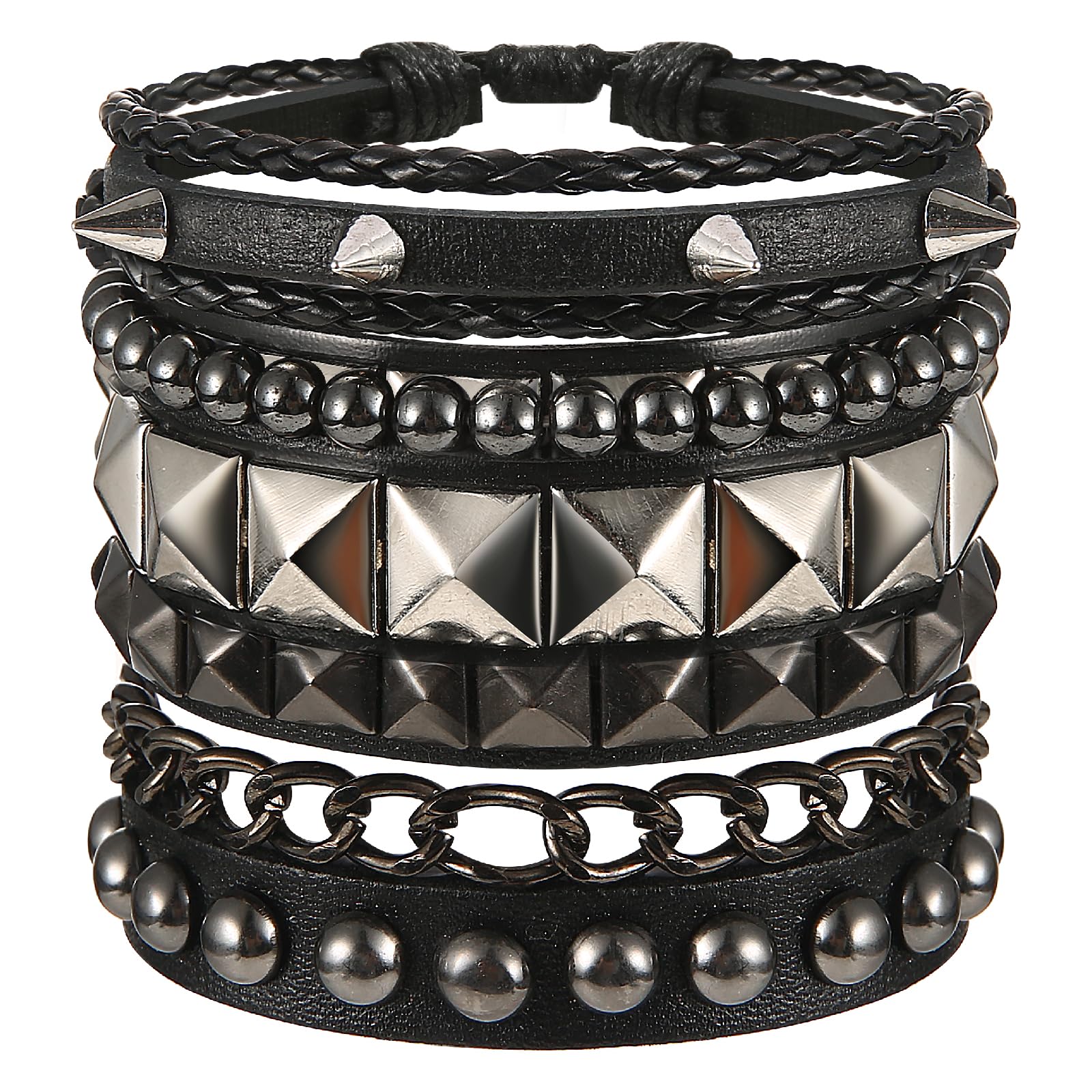Telooco 4Pcs Punk Leather Bracelet Rock Studded Bracelet Set Hematite Braided Leather Bracelets Set 80s Wristband Emo Bracelet Adjustable Goth Bracelets Unisex