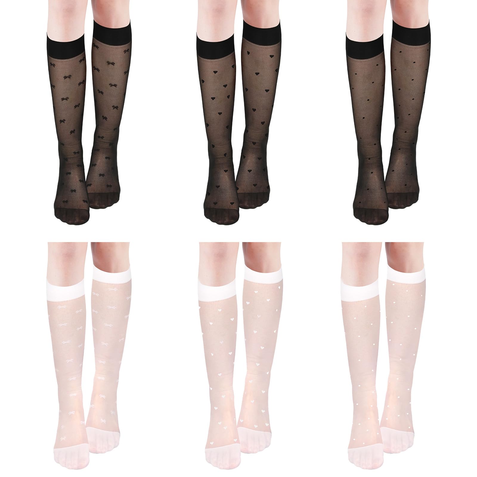 Telooco 6 Pairs Sheer Knee High Stockings 10Denier Nylon Knee Highs for Women Black White Elasticity Stockings with Reinforced Toe