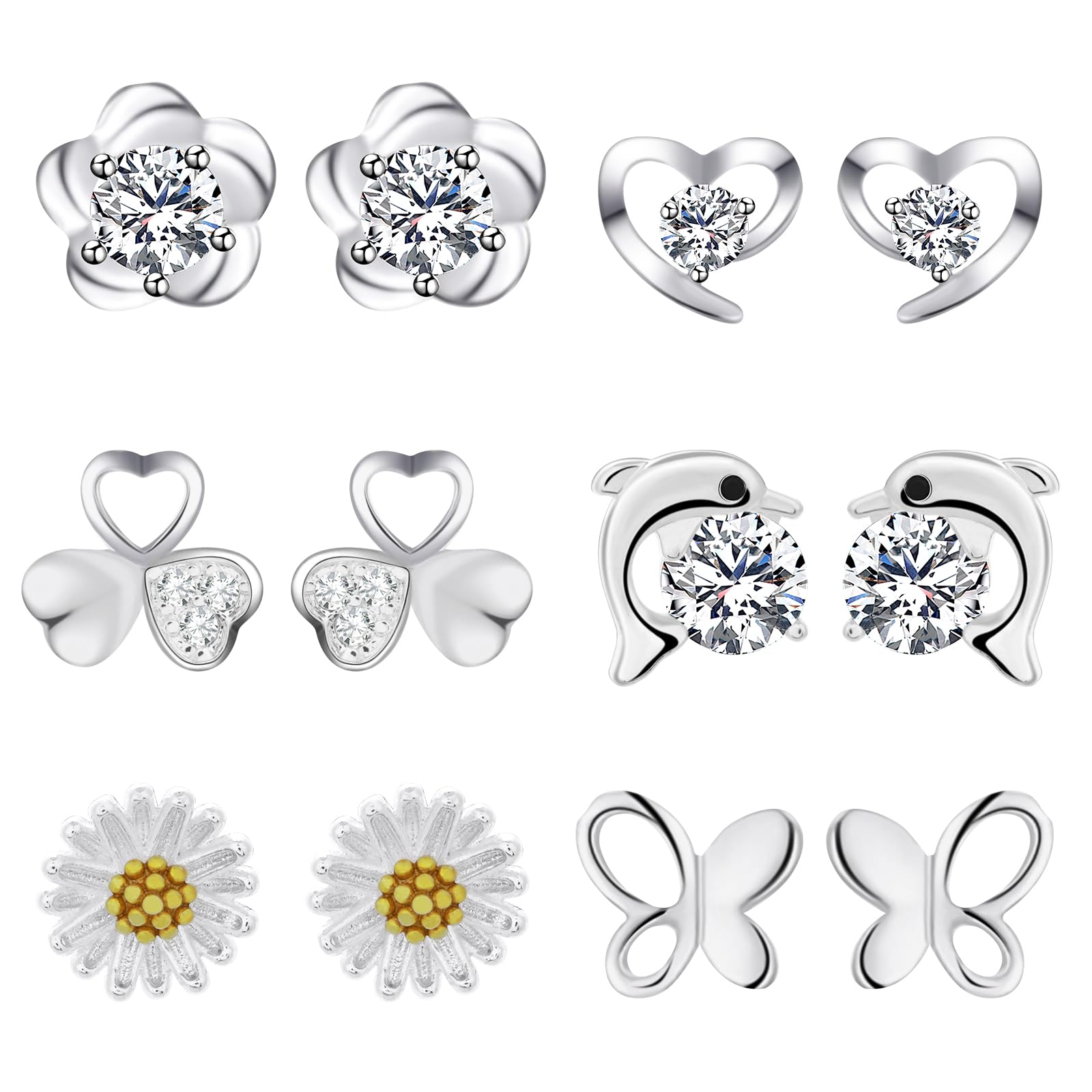 Telooco 6 Pairs Silver Stud Earrings for Women Cartilage Hypoallergenic Earrings Set Small Cute Butterfly Heart Flatback Studs for Girls Cubic Zirconia Stud Earrings