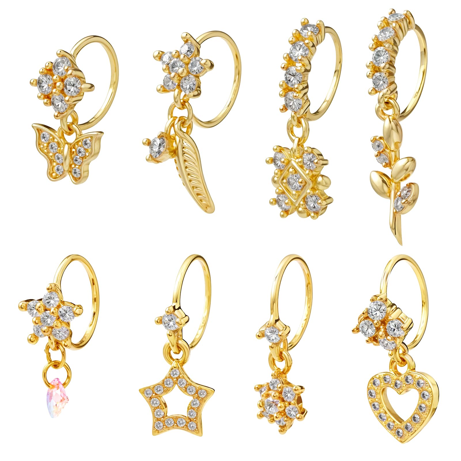 Telooco 8Pcs Dangle Nose Ring 20G Cubic Zirconia Butterfly Star Heart Flower Leaf Gold Dangly Nose Rings Hoop Cute Piercing Jewelry for Women