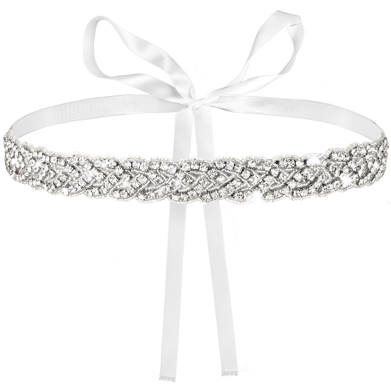 Telooco Bridal Wedding Waist Belt Silver Glitter Rhinestone Sash Belt Handmade Black Ribbon Crystal Belt for Bride Women Formal Dress (White)