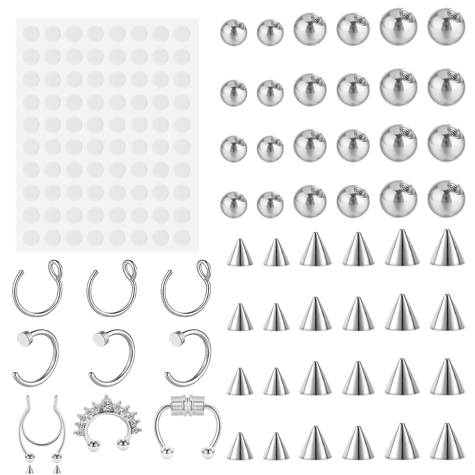 Telooco Fake Eyebrow Ring Fake Lip Nipple Studs Replacement Balls Spike Fake Nose Rings Hoop Fake Septum with 100Pcs Sticker Non-Piercing Body Jewelry 3MM 4MM 5MM