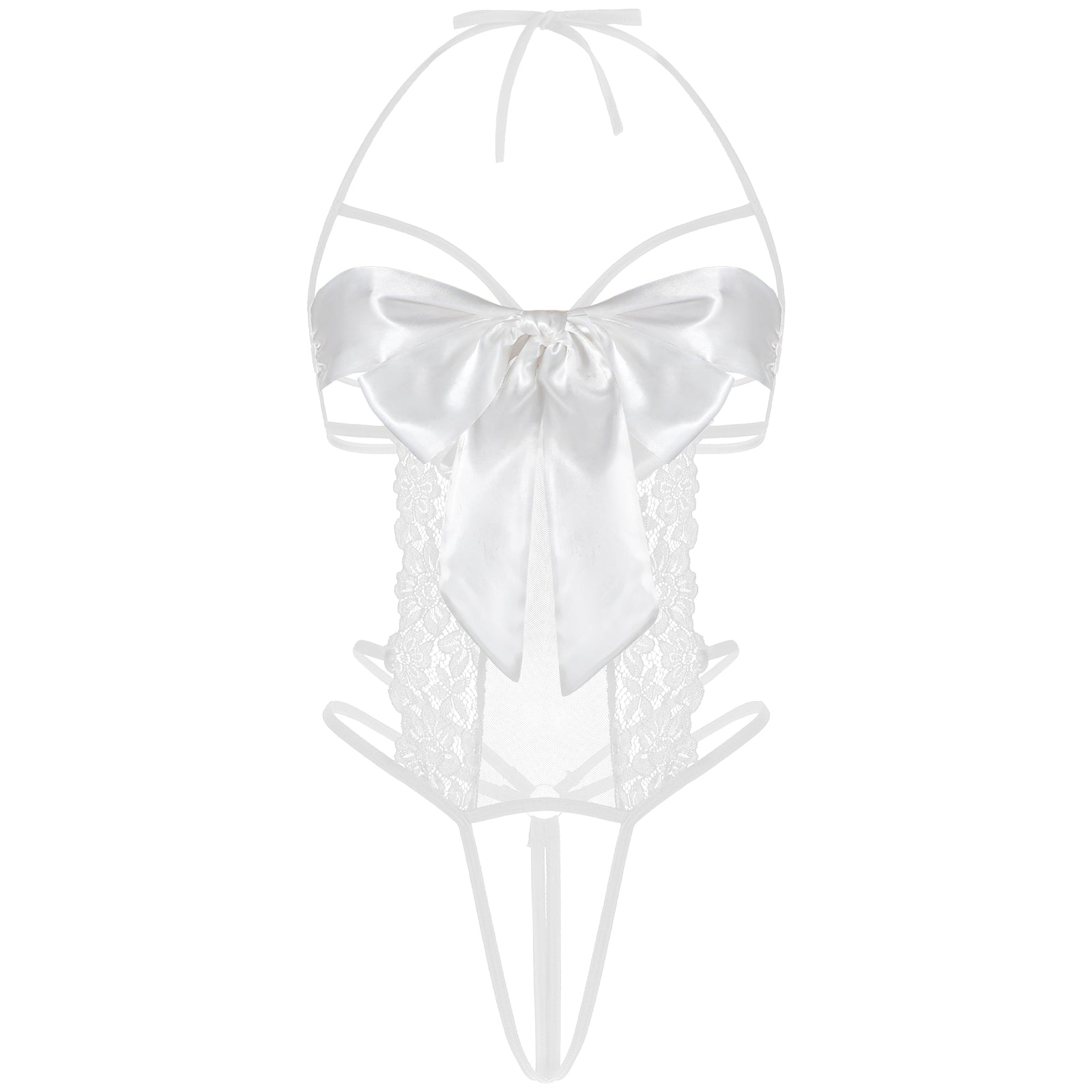 Telooco One Piece Lingerie for Women Lace Teddy Bodysuit Unwrap Me Bow Tie Cutout Strappy Sexy Lingerie Set (White)
