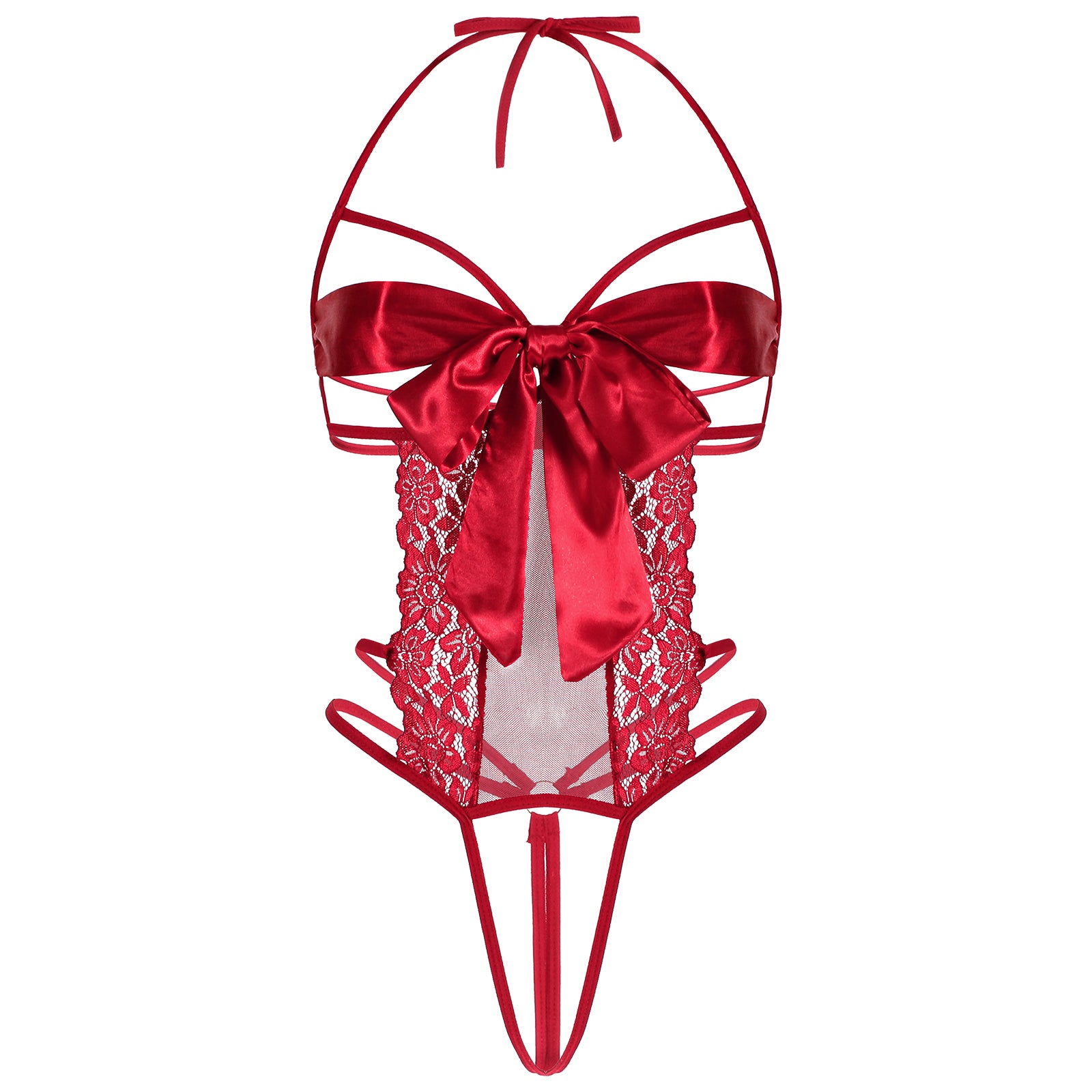 Telooco One Piece Lingerie for Women Lace Teddy Bodysuit Unwrap Me Bow Tie Cutout Strappy Sexy Lingerie Set (Wine Red)